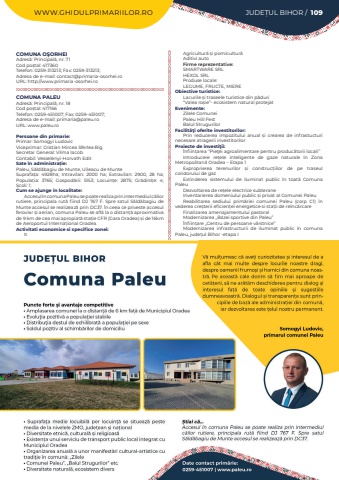 WWW.GHIDULPRIMARIILOR.RO JUDE%u021aUL BIHOR / 109COMUNA O%u015eORHEIAdres%u0103: Principal%u0103, nr. 71Cod po%u0219tal: 417360Telefon: 0259-313213; Fax: 0259-313213; Adresa de e-mail: contact@primaria-osorhei.roURL: http://www.primaria-osorhei.roCOMUNA PALEUAdres%u0103: Principal%u0103, nr. 18Cod po%u0219tal: 417166Telefon: 0259-451007; Fax: 0259-451007; Adresa de e-mail: primaria@paleu.roURL: www.paleu.roPersoane din primarie:Primar: Somogyi LudovicViceprimar: Cristian Mircea Sferlea BigSecretar General: Vilma%u00a0IacobContabil: Vesselenyi-Horvath EditSate %u00een administra%u021bie:Paleu, S%u0103ld%u0103bagiu de Munte, Uileacu de MunteSuprafa%u021ba:%u00a0 4928ha; Intravilan:%u00a0 2000 ha; Extravilan:%u00a0 2900, 28 ha; Popula%u021bia:%u00a0 3765; Gospod%u0103rii:%u00a0 5153; Locuin%u021be:%u00a0 2875; Gr%u0103dini%u021be:%u00a0 4; %u0218coli:%u00a01; Cum se ajunge in localitate:Accesul %u00een comuna Paleu se poate realiza prin intermediul c%u0103ilor rutiere, principala rut%u0103%u00a0 fiind DJ 767 F. Spre satul S%u0103ld%u0103bagiu de Munte accesul se realizeaz%u0103%u00a0prin DC37. %u00cen ceea ce priveste accesul feroviar %u0219i aerian, comuna Paleu se afl%u0103%u00a0la o distan%u021b%u0103%u00a0aproximativa de 9 km de cea mai apropiat%u0103%u00a0sta%u021bie CFR (Gara Oradea) %u0219i de 16km de Aeroportul Interna%u021bional Oradea.Activitati economice si specifice zonei:ItAgricultur%u0103%u00a0%u0219i pomicultur%u0103Aditivi autoFirme reprezentative:SMARTWARE SRLHEXOL SRLProduse locale: LEGUME, FRUCTE, MIEREObiective turistice:Lacurile %u0219i traseele turistice din p%u0103duri %u201cValea ro%u0219ie%u201d- ecosistem natural protejatEvenimente:Zilele ComuneiPaleu Hill FestBalul StrugurilorFacilit%u00e3%u0163i oferite investitorilor:Prin reducerea impozitului anual %u0219i crearea de infrastucturi necesare atragerii investitorilorProiecte de investi%u0163ii:%u00cenfiin%u021barea %u2018%u2019Pie%u0163ei agroalimentare pentru produc%u0103torii locali%u2019%u2019Introducere re%u021bele inteligente de gaze naturale %u00een Zona Metropolitan%u0103 Oradea %u2013 Etapa 1Exproprierea terenurilor %u0219i construc%u021biilor de pe traseul coridorului de gazExtinderea sistemului de iluminat public %u00een toat%u0103 Comuna PaleuDezvoltarea de re%u021bele electrice subteraneInventarierea domeniului public %u0219i privat al Comunei PaleuReabilitarea sediului prim%u0103riei comunei Paleu (corp C1) %u00een vederea cre%u0219terii eficien%u021bei energetice si sta%u021bii de re%u00eenc%u0103rcareFinalizarea amenajamentului pastoralModernizarea %u201eBazei sportive din Paleu%u201d%u00cenfiin%u021bare %u201eCentru de persoane v%u00e2rstnice%u201dModernizarea infrastructurii de iluminat public %u00een comuna Paleu, jude%u021bul Bihor -etapa I