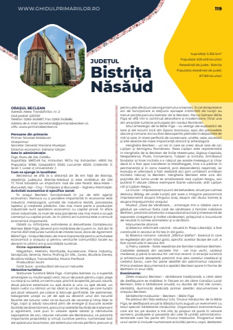 WWW.GHIDULPRIMARIILOR.RO 119Suprafa%u021b%u0103: 5.355 km%u00b2Popula%u021bie: 625.429 locuitoriRe%u0219edin%u021b%u0103 de jude%u021b: Bistri%u021baPopula%u021bia re%u0219edin%u021bei de jude%u021b: 87.169 locuitoriJUDE%u021aULBistri%u021baN%u0103s%u0103udORA%u0218UL BECLEANAdres%u0103: Aleea Trandafirilor, nr. 2Cod po%u0219tal: 425100Telefon: 0263-343687; Fax: 0263-343686; Adresa de e-mail: secretariat@primariabeclean.roURL: www.primariabeclean.roPersoane din primarie:Primar: Nicolae MoldovanViceprimar:%u00a0Secretar General: Mariana Mure%u0219anDirector economic: Adriana G%u00e2rjan%u00a0Sate %u00een administra%u021bie:Figa, Rusu de Jos, Cold%u0103uSuprafa%u021ba:%u00a0 5857,49 ha; Intravilan:%u00a0 957,4 ha; Extravilan:%u00a0 4900 ha; Popula%u021bia:%u00a0 12166; Gospod%u0103rii:%u00a0 5520; Locuin%u021be:%u00a0 6020; Gr%u0103dini%u021be:%u00a0 3; %u0218coli:%u00a01; Licee:%u00a02; Universita%u021bi:%u00a01; Cum se ajunge in localitate:Becleanul se afl%u0103 la o distan%u0163%u0103 de 36 km fa%u0163%u0103 de Bistri%u0163a, re%u015fedin%u0163a jude%u0163ului Bistri%u0163a-N%u0103s%u0103ud %u0219i este str%u0103b%u0103tut de DN 17, fiind totodat%u0103 un important nod de cale ferat%u0103: Baia-Mare %u2013 Bucure%u015fti, Ia%u015fi %u2013 Cluj %u2013 Timi%u015foara %u015fi Bucure%u015fti %u2013 Sighetu-Marma%u0163iei.Activitati economice si specifice zonei:%u00cen ora%u015ful Beclean func%u0163ioneaz%u0103 %u00een jur de 600 agen%u0163i economici. Ramura cu o pondere important%u0103 %u00een economie este industria metalurgic%u0103, urmat%u0103 de industria textil%u0103, procesarea laptelui %u015fi cre%u015fterea p%u0103s%u0103rilor. Cea mai mare parte a produc%u0163iei industriale sunt operatorii economici cu capital privat. %u00cen afara zonei industriale, la nivel de ora%u015f ponderea cea mai mare o ocup%u0103 comer%u0163ul cu capital privat, iar %u00een ultimii ani turismul este o ramur%u0103 economic%u0103 important%u0103.Odat%u0103 cu %u00eenfiin%u0163area, extinderea %u015fi dezvoltarea Complexului Balnear B%u0103ile Figa, devenit prin Hot%u0103r%u00e2rea de Guvern nr. 343 din 19 martie 2021 sta%u021biunea turistic%u0103 de interes local, Zona de Agrement B%u0103ile Figa %u2013 Ora%u015ful Beclean, de mare importan%u0163%u0103 pentru activitatea economic%u0103 a ora%u015fului %u015fi pentru veniturile comunit%u0103%u0163ii locale au devenit %u00een ultimii ani %u015fi activit%u0103%u0163ile turistice.Firme reprezentative:Megatitan, Metrem, Romfulda, Euroservice, Fileca Industry, SandyCola, Serenia, Neira, Profing Dr SRL, Corex, Brut%u0103ria Dene%u0219, Brut%u0103ria Valibya, Transorbatika, Moara PanfoodProduc%u0103tori locali: Gold Juice - produc%u0103tori de sucuri naturaleObiective turistice:Sta%u021biunea Turistic%u0103 B%u0103ile Figa %u2013Complex balnear cu o superb%u0103 amenajare cu multe spa%u0163ii verzi, locuri de joac%u0103 pentru copii, plaje cu nisip %u015fi cu iarb%u0103, un centru spa, piscin%u0103 acoperit%u0103, jacuzzi, saun%u0103, dou%u0103 piscine exterioare cu ap%u0103 dulce %u015fi una cu ap%u0103 s%u0103rat%u0103, un bazin rustic cu n%u0103mol, un lac s%u0103rat %u015fi un r%u00e2u lene%u015f, pe care turi%u015ftii pot pluti relaxant, pe colace %u015fi b%u0103rcu%u0163e gonflabile. De asemenea, toboganele uria%u015fe cu jet de ap%u0103 au devenit unul din locurile favorite ale tuturor celor ce se bucur%u0103 de vacan%u0163e %u015fi timp liber la Figa, copii %u015fi adul%u0163i savur%u00e2nd plini de energie %u015fi bucurie aceste facilit%u0103%u0163i de divertisment, precum %u015fi celelalte facilit%u0103%u0163i de tratament %u015fi agrement, care pun %u00een valoare apele s%u0103rate %u015fi n%u0103molurile sapropelice de aici, resurse naturale ale Becleanului, ce prezint%u0103 importante propriet%u0103%u0163i %u015fi virtu%u0163i curative pentru numeroase boli ale aparatului locomotor, ale sistemului nervos periferic precum %u015fi pentru alte afec%u0163iuni ale organismului omenesc. %u00cen cei doisprezece ani de func%u0163ionare ai sta%u0163iunii aproape 2.000.000 de turi%u015fti au trecut por%u0163ile parcului balnear de la Beclean. Parcul balnear B%u0103ile Figa se afl%u0103 %u00eentr-o continu%u0103 dezvoltare %u015fi modernizare, fiind una din atrac%u0163iile turistice principale din nordul Rom%u00e2niei.Situl arheologic de la B%u0103ile Figa %u2013 cu vestigii ale exploat%u0103rii de sare %u015fi ale locuirii %u00eenc%u0103 din Epoca bronzului, apoi din perioadele dacice %u015fi romane. Aici au fost descoperite, p%u0103strate %u00een depozitele de m%u00e2l %u015fi sare, %u00een stare perfect%u0103 de conservare, unelte, vase, accesorii %u015fi alte obiecte de mare importan%u0163%u0103 istoric%u0103 %u015fi arheologic%u0103.Herghelia Beclean %u2013 un loc %u00een care se cresc dou%u0103 rase de cai: Lipi%u0163an %u015fi Semigreu Rom%u00e2nesc. Rasa Lipi%u0163an este reprezentat%u0103 %u00een Herghelia de la Beclean de liniile Maestuoso, Siglavy-Capriola, Neapoletano, Pluto, Conversano, Tulipan %u015fi Incitato. Arm%u0103sarul fondator al liniei Incitato s-a n%u0103scut pe aceste meleaguri %u015fi chiar dac%u0103 el a fost apoi transferat la Mez%u0151hegyes, linia s-a p%u0103strat %u00een permanen%u0163%u0103 %u015fi %u00een zona noastr%u0103, prin descenden%u0163ii repatria%u0163i, iar evolu%u0163ia ei ulterioar%u0103 a fost realizat%u0103 aici prin urm%u0103torii arm%u0103sari Incitato n%u0103scu%u0163i la Beclean. Herghelia Beclean este una din pu%u0163inele din lume unde se amelioreaz%u0103 rasa Lipi%u0163an Negru, aici put%u00e2nd fi v%u0103zute c%u00e2teva exempare foarte valoroase, at%u00e2t Lipi%u0163an c%u00e2t %u015fi Lipi%u0163an NegruLa Cruce %u2013 impresionant punct de belvedere, situat pe culmea dealului Bileag, de unde turi%u015ftii pot avea o imagine panoramic%u0103 impresionant%u0103 asupra %u00eentrgului ora%u015f, asupra v%u0103ii r%u00e2ului Some%u015f %u015fi asupra %u00eemprejurimilor ora%u015fuluiMuzeul ,,Casa de V%u00e2n%u0