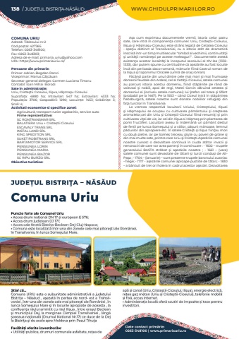 138 / JUDE%u021aUL BISTRI%u021aA-N%u0102S%u0102UD WWW.GHIDULPRIMARIILOR.ROCOMUNA URIUAdres%u0103: Tiblesului nr.2Cod po%u0219tal: 427365Telefon: 0263-348100; Fax: 0263-348303; Adresa de e-mail: primaria_uriu@yahoo.comURL: https://www.primariauriu.ro/Persoane din primarie:Primar: Adrian-Bogdan DanciViceprimar: Marius C%u00e2%u0163c%u0103uanSecretar general delegat: Carmen Luciana TimaruContabil: Ioan Mihai%u00a0%u00a0BorodiSate %u00een administra%u021bie:Uriu, Criste%u015ftii Ciceului, Ili%u015fua, H%u0103%u015fma%u015fu CiceuluiSuprafa%u021ba:%u00a0 4880 ha; Intravilan:%u00a0 547 ha; Extravilan:%u00a0 4333 ha; Popula%u021bia:%u00a0 3706; Gospod%u0103rii:%u00a0 1290; Locuin%u021be:%u00a0 1453; Gr%u0103dini%u021be:%u00a0 3; %u0218coli:%u00a04; Activitati economice si specifice zonei:Agricultur%u0103, transport rutier agabaritic, service autoFirme reprezentative:SC RONTRANSMAR SRLBALATIERA Uriu + Criste%u0219tii CiceuluiESCAVALY TRANS SRLINSTAL LAND SRLKING SPEDITION SRLSUKET ROBITRANS SRLBARTAMOTOR SERVICE SRLPENSIUNEA LORINPENSIUNEA MARIAPENSIUNEA BIAZOR SC RIPU BURZO SRLObiective turistice:A%u015fa cum exprimau documentele vremii, istoria celor patru sate, care intr%u0103 %u00een componen%u0163a comunei: Uriu, Criste%u015ftii-Ciceului, Ili%u015fua %u015fi H%u0103%u015fma%u015fu-Ciceului, este str%u00e2ns legat%u0103 de Cetatea Ciceului - spa%u0163iu distinct al Transilvaniei, cu o istorie at%u00e2t de dramatic%u0103 %u00eenscris%u0103 %u00eentr-un timp multisecular %u201csimbol al vechimii, continuit%u0103%u0163ii %u015fi unit%u0103%u0163ii rom%u00e2ne%u015fti pe aceste meleaguri%u201c . Documentele atest%u0103 existen%u0163a acestor localit%u0103%u0163i la %u00eenceputul secolului al XIV-lea (1332-1333), dar putem spune cu certitudine c%u0103 a%u015fez%u0103rile au fost locuite %u00eenc%u0103 din perioada daco-roman%u0103, m%u0103rturie fiind Castrul roman de la Ili%u015fua %u015fi toponimul Orazele (urm%u0103 de ora%u015f roman)F%u0103c%u00e2nd parte din unul dintre cele mai mari %u015fi mai frumoase domenii feudale din Ardeal, cel al Cet%u0103%u0163ii-Ciceului, satele comunei au parcurs istoria acestui domeniu, fiind st%u0103p%u00e2nite pe r%u00e2nd de voievozi %u015fi nobili, apoi de regi, Matei Corvin d%u0103ruind cetatea %u015fi domeniul ei (inclusiv satele comunei) lui %u015etefan cel Mare %u015fi Sf%u00e2nt (probabil pe la 1467). Pe la 1553 %u2013 c%u00e2nd Ciceul intr%u0103 %u00een st%u0103p%u00e2nirea habsburgic%u0103, satele noastre sunt donate nobililor refugia%u0163i din fa%u0163a turcilor %u00een Transilvania La vremea respectiv%u0103 locuitorii Uriului, Criste%u015ftiului, Ili%u015fuei %u015fi H%u0103%u015fma%u015fului se ocupau cu cultivarea p%u0103m%u00e2ntului %u015fi cre%u015fterea animalelor,cei din Uriu %u015fi Criste%u015ftii-Ciceului fiind renumi%u0163i %u015fi prin cultivarea vi%u0163ei de vie, iar cei din Ili%u015fua si H%u0103%u015fma%u015f prin plantarea de pomi fructiferi. Locuitorii aveau la %u00eendem%u00e2n%u0103 un p%u0103m%u00e2nt destul de fertil pe lunca Some%u015fului %u015fi a v%u0103ilor, p%u0103%u015funi m%u0103noase, lemnul p%u0103durilor din apropiere etc. %u00cen satele Criste%u015fti %u015fi Ili%u015fua fiin%u0163au mori cu dou%u0103 pietre, iar pe Some%u015f treceau plute cu poveri de gr%u00e2ne %u015fi din mai multe sate, printre care Uriu %u015fi Criste%u015fti.A%u015fez%u0103rile comunei noastre cunosc o dezvoltare continu%u0103 %u00een ciuda at%u00e2tor invazii %u015fi nenorociri de care vor avea parte %u015fi %u00een continuare : - 1602 %u2013 trupele generalului BASTA str%u0103bat %u015fi a%u015fez%u0103rile noastre ; - 1661 %u2013 (vara) satele comunei sunt devastate de t%u0103tarii %u015fi turcii condu%u015fi de AliPa%u015fa ; - 1704 %u2013 (ianuarie) %u2013 sunt prezente trupele baronului austriac %u2013Tiege; - 1717 - a%u015fez%u0103rile comunei aproape pustiite de t%u0103tari; - 1830 %u2013 a b%u00e2ntuit de trei ori holera %u00een cadrul acestor a%u015fez%u0103ri. Dezvoltarea