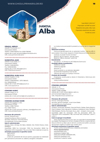 WWW.GHIDULPRIMARIILOR.RO 19Suprafa%u021b%u0103: 6.242 km%u00b2Popula%u021bie: 401.687 locuitoriRe%u0219edin%u021b%u0103 de jude%u021b: Alba IuliaPopula%u021bia re%u0219edin%u021bei de jude%u021b: 72.405 locuitoriJUDE%u021aULAlbaORA%u0218UL ABRUDAdres%u0103: P-%u0163a Eroilor, nr. 1Cod po%u0219tal: 515100Telefon: 0258-780519; Fax: 0258-780265; Adresa de e-mail: secretariat@primariaabrud.roURL: www.primaria-abrud.roMUNICIPIUL AIUDAdres%u0103: Cuza Vod%u0103, nr. 1Cod po%u0219tal: 515200Telefon: 0258-861310; Fax: 0258-861280; Adresa de e-mail: office@aiud.roURL: http://www.aiud.roMUNICIPIUL ALBA IULIAAdres%u0103: Mo%u0163ilor, nr. 5ACod po%u0219tal: 510118Telefon: 0258-819462 , 0372-586401; Fax: 0258-812545; Adresa de e-mail: office@apulum.roURL: www.apulum.roCOMUNA ALBACAdres%u0103: Clo%u015fca, nr. 9Cod po%u0219tal: 517005Adresa de e-mail: primaria@comunaalbac.roCOMUNA ALMA%u015eU MAREAdres%u0103: Principal%u0103, nr. 204Cod po%u0219tal: 517030Telefon: 0358-732140; Fax: 0358-732141; Adresa de e-mail: primaria_almasu_mare@yahoo.comURL: www.almasumare.roPersoane din primarie:Primar: Zaharie AronViceprimar:Burzu Petru CosminSecretar interimar: Hanche%u0219 ElenaContabilitate: Firma externalizataSate %u00een administra%u021bie:Alma%u015fu Mare, Alma%u015fu De Mjloc, Br%u0103det, Cib, Cheile Cibului, Glod, N%u0103d%u0103%u015ftiaSuprafa%u021ba:%u00a0 9330 ha; Intravilan:%u00a0 1330 ha; Extravilan:%u00a0 8000 ha; Popula%u021bia:%u00a01472; Gospod%u0103rii:%u00a0715; Locuin%u021be:%u00a0760; Gr%u0103dini%u021be:%u00a05; %u0218coli:%u00a06; Activitati economice si specifice zonei:Agricultur%u0103AgroturismUnele din prest%u0103rile de servicii pentru popula%u0163ie se realizeaz%u0103 prin persoane autorizate ca: zid%u0103rie %u015fi dulg%u0103rie, t%u00e2mpl%u0103rieLa nivelul comunei exist%u0103 %u00een prezent un num%u0103r de 14 magazine private%u00a0Obiective turistice:Comuna beneficieaz%u0103 de un poten%u0163ial turistic, care se afl%u0103 %u00een zona satelor Cib %u015fi Glod, respectiv Cheile Cibului %u015fi Cheile GloduluiColec%u0163ia muzeal%u0103 %u201cAchim Emilian%u201dBiserica %u201cBuna Vestire%u201d, Alma%u015fu MareBiserica %u201cSf%u00e2ntu Nicolae%u201d, satul CibEvenimente:Fiii satului - %u00een fiecare an de %u00cen%u0103l%u0163area DomnuluiFacilit%u00e3%u0163i oferite investitorilor:Telefonie mobil%u0103Telefonie digital%u0103Semnal TVZon%u0103 turistic%u0103 cu un pitoresc deosebitScutirea de impozite %u015fi taxe localeOferirea de terenuri la pre%u0163uri minimeProiecte de investi%u0163ii:Finalizarea construc%u0163iei %u015fi darea %u00een folosin%u0163%u0103 a C%u0103minului din satul N%u0103d%u0103%u015ftia Utilaj multifunc%u021bionalCOMUNA ARIE%u015eENIAdres%u0103: nr. 19Cod po%u0219tal: 517040; Telefon: 0358-402989; Adresa de e-mail: arieseni@ab.e-adm.ro, primariaarieseni@yahoo.comURL: https://comuna-arieseni.ro/Persoane din primarie:Primar: Gheorghe PanteaSecretar general delegat : Ionel Viorel BeleiContabil:Serviciu ExternalizatSate %u00een administra%u021bie:Arie%u015feni, Avr%u0103me%u015fti, Bube%u015fti, Casa de Piatr%u0103, Coble%u015f, Dealu Bajului, Fa%u0163a-Cristesei, Fa%u0163a-L%u0103pu%u015fului, Galbena, Hodobana, Izlaz, P%u0103nte%u015fti, P%u0103tr%u0103h%u0103i%u0163e%u015fti, Poini%u021ba, Ravice%u015fti, Sturu, %u015etei - Arie%u015feni, Vanvuce%u015ftiSuprafa%u021ba:%u00a0 3322 ha; Intravilan:%u00a0 450 ha; Extravilan:%u00a0 2872 ha; Popula%u021bia:%u00a01570; Gospod%u0103rii:%u00a0782; Locuin%u021be:%u00a0520; Gr%u0103dini%u021be:%u00a01; %u0218coli:%u00a01; Licee:%u00a01; Cum se ajunge in localitate:Zona reprezint%u0103 centrul unui cerc ce cuprinde la extremitatea sa ora%u015fele: Cluj Napoca la 141 km, Oradea la 120 km, Arad la 182 km, Deva la 133 km %u015fi Alba Iulia la 120 km constituind astfel o atrac%u0163ie aproximativ egal%u0103 a turi%u015ftilor din aceste zoneActivitati economice si specifice zonei:Turism, prelucrarea lemnului, cre%u0219terea animalelorFirme reprezentative:MAGDAFARM S.R.L.MONVASI FOREST SRLDAN SCHI SPORT ARIE%u015eENI SRLARISTUR CAMPENI S.R.LCOMPLEX TURISTIC VANK