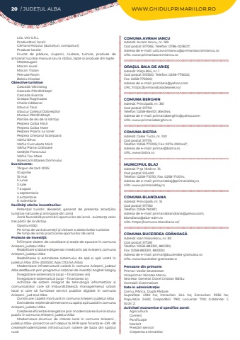 20 / JUDE%u021aUL ALBA WWW.GHIDULPRIMARIILOR.ROLOL VIO S.R.LProduc%u0103tori locali:C%u0103mara Mo%u021bului (dulce%u021buri, compoturi)Produse locale:Fructe de p%u0103dure, ciuperci, ciubere, tulnice, produse de artizanat lucrate manual sau la r%u0103zboi, lapte %u0219i produse din lapteMe%u0219te%u0219ugari:Mocan AurelMocan TraianPetruse Rovin Beleiu NicolaeObiective turistice:Cascada V%u00e2rciorogCascada P%u0103tr%u0103h%u0103ite%u015ftiCascada EvantaiGroapa RuginoasaCheile G%u0103lbeneiIzbucul TauzIzbucul Cote%u0163ul Dobre%u015ftilorMuzeul P%u0103tr%u0103h%u0103ite%u015ftiP%u00e2rtiile de ski de la V%u00e2rtopPe%u015ftera Coiba Mic%u0103Pe%u015ftera Coiba MarePe%u015ftera Poarta lui IonelPe%u015ftera Ghe%u0163arul Sc%u0103ri%u015foaraV%u00e2rful BihorV%u00e2rful Curcubata Mic%u0103V%u00e2rful Piatra Gr%u0103itoareCet%u0103%u0163ile PonoruluiV%u00e2rful Tau MareBiserica %u00cen%u0103l%u0163area DomnuluiEvenimente:T%u00e2rguri de %u0163ar%u0103 2025:10 aprilie15 mai5 iunie3 iulie7 august4 septembrie2 octombrie6 noiembrieFacilit%u00e3%u0163i oferite investitorilor:Poten%u0163ial turistic deosebit, generat de prezen%u0163a atrac%u0163iilor turistice naturale %u015fi antropice din zon%u0103Zon%u0103 favorabil%u0103 practic%u0103rii sporturilor de iarn%u0103 - existen%u0163a celor trei p%u00e2rtii de la V%u00e2rtopOportunit%u0103%u0163i:Pe timp de var%u0103 drume%u0163ii %u015fi vizitare a obiectivelor turisticePe timp de iarn%u0103 practicarea sporturilor de iarn%u0103%u00a0Proiecte de investi%u0163ii:%u00cenfiin%u021bare sistem de canalizare %u0219i sta%u021bie de epurare %u00een comuna Arie%u0219eni, jude%u021bul%u00a0AlbaReabilitare %u0219i dotare dispensar medical %u00een sat Arie%u0219eni, comuna Arie%u0219eni, jude%u021bul%u00a0AlbaReabilitarea %u0219i extinderea sistemului de ap%u0103%u00a0 %u0219i ap%u0103%u00a0 uzat%u0103%u00a0 %u00een jude%u021bul Alba 2014-2020(SC Apa Ctta SA Alba)Modernizare infrastructur%u0103 rutier%u0103%u00a0%u00een comuna Arie%u0219eni, jude%u021bul Alba%u00a0desf%u0103%u0219urat prin programul na%u021bional de investi%u021bii Anghel Saligny%u00cenregistrare sistematic%u0103%u00a0(ocpi %u2013 finan%u021barea viii)%u00cenregistrare sistematic%u0103%u00a0(ocpi %u2013 finantarea ix)Achizi%u021bie de sistem integrat de tehnologia informat%u021bilor %u0219i comunica%u021biilor care s%u0103%u00a0 %u00eembun%u0103t%u0103%u021beasc%u0103%u00a0 managemenul urban local %u0219i care s%u0103%u00a0 furnizeze servicii publice digitale %u00een comuna Arie%u0219eni , jud e%u021bul AlbaConstruire capel%u0103%u00a0mortuar%u0103%u00a0%u00een comuna Arie%u0219eni jude%u021bul AlbaExtinderea re%u021belei de alimentare cu ap%u0103 %u0219i ap%u0103 uzat%u0103 %u00een comuna Arie%u0219eni, jude%u021bul AlbaCre%u0219terea eficen%u021bei energetice prin modernizarea iluminatului public %u00een comuna Arie%u0219eni, jude%u021bul AlbaModernizare drumuri de interes local %u00een comuna Arie%u0219eni , jude%u021bul Alba%u2013 proiect ce va fi depus la AFIR spre finan%u021bare %u2013DR -28 crearea/modernizarea infrastructurii rutiere de baza din spa%u021biul ruralCOMUNA AVRAM IANCUAdres%u0103: Avram Iancu, nr. 169Cod po%u0219tal: 517065; Telefon: 0786-023607; Adresa de e-mail: uatcavramiancu@primariaavramiancu.roURL: www.primariaavramiancu.roORA%u0218UL BAIA DE ARIE%u015eAdres%u0103: Pia%u0163a B%u0103ii, nr. 1Cod po%u0219tal: 515300; Telefon: 0258-775002; Fax: 0258-775900; Adresa de e-mail: primbaia@yahoo.comURL: https://primariabaiadearies.ro/COMUNA BERGHINAdres%u0103: Principal%u0103, nr. 361Cod po%u0219tal: 517110Telefon: 0258-854101, 854344; Adresa de e-mail: primariaberghin@yahoo.comURL: www.primariaberghin.roCOMUNA BISTRAAdres%u0103: Calea Turzii, nr. 100Cod po%u0219tal: 517115Telefon: 0258-773105; Fax: 0374-090447; Adresa de e-mail: primar@bistra.roURL: www.bistra.roMUNICIPIUL BLAJAdres%u0103: P-%u0163a 1848 nr. 16Cod po%u0219tal: 515400Telefon: 0258-710110; Fax: 0258-710014; Adresa de e-mail: primariablaj@primariablaj.roURL: www.primariablaj.roCOMUNA BLANDIANAAdres%u0103: Principal%u0103, nr. 15Cod po%u0219tal: 517160Telefon: 0258-760811; Adresa de e-mail: primariablandiana@yahoo.com, blandiana@ab.e-adm.roURL: https://comuna-blandiana.ro/COMUNA BUCERDEA GR%u00c2NOAS%u0102Adres%u0103: Ioan Maiorescu, nr. 82Cod po%u0219tal: 517261Telefon: 0258-883301, 883330; Fax: 0258-883301, 883330; Adresa de e-mail: primar@bucerdea-granoasa.roURL: www.bucerdea-granoasa.roPersoane din primarie:Primar: Vasile SevestreanViceprimar: Nicolae MarcuSecretar General: Dorel Cristian%u00a0B%u0103l%u0103u%u00a0Contabil: ExternalizatSate %u00een administra%u021bie:Cornu, P%u00e2nca, Dup%u0103 P%u0103dureSuprafa%u021ba:%u00a0 4180 ha; Intravilan:%u00a0 244 ha; Extravilan:%u00a0 3936 ha; Popula%u021bia:%u00a0 2450; Gospod%u0103rii:%u00a0 780; Locuin%u021be:%u00a0 700; Gr%u0103dini%u021be:%u00a0 1; %u0218coli:%u00a02; Activitati economice si specifice zonei:Agricultur%u0103Comer%u0163Panifica%u0163ieMor%u0103ritPrest%u0103ri serviciiCre%u015fterea animalelor