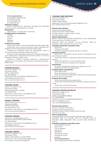 WWW.GHIDULPRIMARIILOR.RO JUDE%u021aUL ALBA / 21Firme reprezentative:SC INDAGRA NICOARA SRLSC GLISS ELLA SRLSC MICA ROMA SRLSC AVIASTAR SRL%u00a0Obiective turistice:Biserica reformat%u0103 din Bucerdea Gr%u00e2noas%u0103 este declarat%u0103 monument istoric %u015fi dateaz%u0103 din anul 1303Evenimente:Zilele Bucerzii - din data de 12 octombrieFacilit%u00e3%u0163i oferite investitorilor:Utilit%u0103%u0163i: Gaz Ap%u0103CurentTelefonieInternet.Proiecte de investi%u0163ii:Modernizare str%u0103zi %u00een comuna Bucerdea Gr%u00e2noas%u0103, jude%u021bul AlbaConstruirea unei locuin%u021be de serviciu pentru speciali%u0219ti din s%u0103n%u0103tate %u00een Comuna Bucerdea Gr%u00e2noas%u0103, jude%u021bul AlbaRealizarea %u0219i extinderea re%u021belei de supraveghere video %u00een Comuna Bucerdea Gr%u00e2noas%u0103+2 sta%u021bii re%u00eenc%u0103rcare%u00cenfiin%u021barea unei capacit%u0103%u021bi de produc%u021bie a energiei electrice din surs%u0103 solar%u0103 pentru acoperirea consumului propriu %u00een Comuna Bucerdea Gr%u0103noas%u0103, Jude%u021bul Alba Dotarea cu mobilier, materiale didactice %u0219i echipamente digitale a %u0218colii Gimnaziale %u201eIoan Maiorescu%u201d Bucerdea Gr%u00e2noas%u0103 , jude%u021bul AlbaCOMUNA BUCIUMAdres%u0103: Principal%u0103, nr. 25Cod po%u0219tal: 517165Telefon: 0258-784112; Fax: 0372-898512; Adresa de e-mail: primaria.bucium@yahoo.comprimaria@comunabucium.roURL: www.primariabucium.roCOMUNA C%u00c2LNICAdres%u0103: Principal%u0103, nr. 20Cod po%u0219tal: 517205Telefon: 0258-747101 , 747050; Fax: 0258-747041; Adresa de e-mail: primaria_calnic@yahoo.comURL: www.primaria-calnic.roORA%u0218UL C%u00c2MPENIAdres%u0103: Pia%u0163a Avram Iancu, nr. 5Cod po%u0219tal: 515500Telefon: 0258-771215; Fax: 0258-771215 int 12; Adresa de e-mail: primaria_cimpeni@yahoo.comURL: www.primariacimpeni.roCOMUNA CENADEAdres%u0103: Str. Ion Ag%u00e2rbiceanu, Nr. 9Cod po%u0219tal: 517210; Telefon: 0258-789104; Fax: 0258-789104; Adresa de e-mail: primariacenade@yahoo.comcenade@ab.e-adm.roURL: www.comunacenade.roCOMUNA CERG%u0102UAdres%u0103: Principal%u0103, nr. 126Cod po%u0219tal: 517216Telefon: 0258-719302; Fax: 0258-719302; Adresa de e-mail: primariacergau@yahoo.comURL: https://www.primariacergau.ro/COMUNA CERU-B%u0102C%u0102IN%u0162IAdres%u0103: Principal%u0103, nr. 5Cod po%u0219tal: 517220Telefon: 0258-700840,; Adresa de e-mail: primariacerubacainti@yahoo.comURL: http://cerubacainti.ro/Persoane din primarie:Primar: Ciprian %u0218tefan%u00a0Borza%u00a0Viceprimar: Adrian Vasile BardanSecretar General:%u00a0 Andreea Iuliana%u00a0%u00a0Cri%u0219an%u00a0Contabil: Rodica CosteaSate %u00een administra%u021bie:Bulbuc, Viezuri, Ceru-B%u0103c%u0103in%u0163i, Dumbr%u0103vi%u0163a, Cucuta, Bolov%u0103ne%u015fti, Gro%u015fi, Valea Mare, F%u00eent%u00eenele, CurpeniSuprafa%u021ba:%u00a0 4950 ha; Intravilan:%u00a0 90 ha; Extravilan:%u00a0 4860 ha; Popula%u021bia:%u00a0308; Gospod%u0103rii:%u00a0113; Locuin%u021be:%u00a0195; Activitati economice si specifice zonei:Apicultur%u0103Cre%u015fterea animalelorV%u00e2nzarea produselor agricole, apicole, animaliereObiective turistice:Piatra Tomii - monument natural, unde s-au descoperit urme ale civiliza%u0163iei Co%u0163ofeniPiatra Mare, unde s-au descoperit obiecte din epoca bronzului timpuriuCentrul Etnografic din comun%u0103, specific zoneiToat%u0103 comuna este un peisaj turistic deosebitEvenimente:Fiii satului (S%u0103rb%u0103toarea Salc%u00e2mului), sf%u00e2r%u015fitul lunii maiFestivalul Prunelor, luna septembrieFacilit%u00e3%u0163i oferite investitorilor:Zon%u0103 defavorizat%u0103Drum de acces bun %u00een comun%u0103Sprijin din partea Prim%u0103riei pentru identificarea %u015fi %u00eent%u0103bularea terenului pentru cei interesa%u0163iProiecte de investi%u0163ii:Construirea unei pensiuni agroturisticeCentru de achizi%u0163ii %u015fi prelucrare produse animaliere, apicole %u015fi fructeConstruirea unei ferme piscicoleCOMUNA CETATEA DE BALT%u0102Adres%u0103: Str. Cet%u0103%u0163ii, nr. 32Cod po%u0219tal: 517235Telefon: 0258-886128, 886364; Fax: 0258-886364; Adresa de e-mail: contact@cetateadebalta.roprimariacdb@yahoo.comURL: www.cetateadebalta.roPersoane din primarie:Primar: Constantin%u00a0Comandaru%u00a0Viceprimar: Sorin Emanuil SuciuSecretar General: Cristina Andreea P%u0103curar Laz%u0103rContabil: Ana%u00a0Ra%u0163iu%u00a0Sate %u00een administra%u021bie:Cetatea de Balt%u0103, Cr%u0103ciunelul de Sus, S%u00e2nt%u0103m%u0103rie, T%u0103t%u00e2rlauaSuprafa%u021ba:%u00a0 6441 ha; Intravilan:%u00a0 6161 ha; Extravilan:%u00a0 280 ha; Popula%u021bia:%u00a0 3086; Gospod%u0103rii:%u00a0 1284; Locuin%u021be:%u00a0 1284; Gr%u0103dini%u021be:%u00a0 2; %u0218coli:%u00a02; Activitati economice si specifice zonei:Extrac%u021bie gaze naturaleAgricultur%u0103Culturi vegetaleViticultur%u0103ZootehnieActivit%u0103%u021bi de comer%u021bActivit%u0103%u021bi de turismCroitorieFirme reprezentative:SNGN ROMGAZSUCURSALA MEDIA%u0218