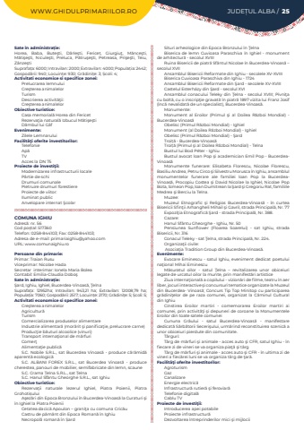 WWW.GHIDULPRIMARIILOR.RO JUDE%u021aUL ALBA / 25Sate %u00een administra%u021bie:Horea, Baba, Bute%u015fti, D%u00e2rle%u015fti, Fericet, Giurgiu%u0163, M%u0103nce%u015fti, M%u0103ti%u015fe%u015fti, Nicule%u015fti, Preluca, P%u0103tru%u015fe%u015fti, Petreasa, Pri%u015fe%u015fti, Teiu, Z%u00e2nze%u015ftiSuprafa%u021ba:%u00a06000; Intravilan:%u00a02000; Extravilan:%u00a04000; Popula%u021bia:%u00a02442; Gospod%u0103rii:%u00a0940; Locuin%u021be:%u00a0930; Gr%u0103dini%u021be:%u00a03; %u0218coli:%u00a04; Activitati economice si specifice zonei:Prelucrarea lemnuluiCre%u015fterea animalelorTurismDescrierea activit%u0103%u0163ii:Cre%u015fterea animalelorObiective turistice:Casa memorial%u0103 Horea din FericetRezerva%u0163ia natural%u0103 Izbucul M%u0103ti%u015fe%u015ftiD%u00e2mbul lui G%u00e2fEvenimente:Zilele LemnaruluiFacilit%u00e3%u0163i oferite investitorilor:TelefonieAp%u0103TVAcces la DN 75Proiecte de investi%u0163ii:Modernizarea infrastructurii localeP%u00e2rtie de schiDrumuri comunalePietruire drumuri forestiereProiecte de viitor:Iluminat publicAnvelopare internat %u015ecolarCOMUNA IGHIUAdres%u0103: nr. 56Cod po%u0219tal: 517360Telefon: 0258-844103; Fax: 0258-844103; Adresa de e-mail: primariaighiu@yahoo.comURL: www.comunaighiu.roPersoane din primarie:Primar:%u00a0Traian%u00a0Rusu%u00a0Viceprimar: Nicolae HadaSecretar%u00a0 interimar: Ionela Maria BoleaContabil: Emilia-Claudia%u00a0Dobo%u015fSate %u00een administra%u021bie:%u015eard, Ighiu, Ighiel, Bucerdea-Vinoas%u0103, %u0162elnaSuprafa%u021ba:%u00a0 12952ha; Intravilan:%u00a0 943,21 ha; Extravilan:%u00a0 12008,79 ha; Popula%u021bia:%u00a07060; Gospod%u0103rii:%u00a02517; Locuin%u021be:%u00a02170; Gr%u0103dini%u021be:%u00a05; %u0218coli:%u00a05; Activitati economice si specifice zonei:Cre%u015fterea animalelorAgricultur%u0103TurismComercializarea produselor alimentareIndustrie alimentar%u0103 (mor%u0103rit %u015fi panifica%u0163ie, prelucrare carne)Produc%u0163ie b%u0103uturi alcoolice (vinuri)Transport interna%u0163ional de m%u0103rfuriComer%u0163Alimenta%u0163ie public%u0103S.C. Nobile S.R.L., sat Bucerdea Vinoas%u0103 - produce c%u0103r%u0103mid%u0103 aparent%u0103 ecologic%u0103S.C. ALBANI FOREX S.R.L., sat Bucerdea Vinoas%u0103 - produce cherestea, panouri de mobilier, semifabricate din lemn, scauneS.C. Crama %u021aelna S.R.L., sat %u021aelnaS.C. Hanul Sf%u00e2ntu Gheorghe S.R.L., sat Ighiu%u00a0Obiective turistice:Rezerva%u0163ii naturale lezerul Ighiel, Piatra Poienii, Piatra Grohoti%u0219uluiA%u015fez%u0103ri din Epoca Bronzului %u00een Bucerdea-Vinoas%u0103 la Curaturi %u015fi %u00een Ighiel la Piatra PoieniiCetatea dacic%u0103 Apoulon %u2013 grani%u0163a cu comuna Cric%u0103uCastru de p%u0103m%u00e2nt din Epoca Roman%u0103 %u00een IghiuNecropol%u01ce roman%u0103 %u00een %u0218ardSituri arheologice din Epoca Bronzului %u00een %u0162elnaBiserica de lemn Cuvioasa Paraschiva %u00een Ighiel - monument de arhitectur%u0103 - secolul XVIIIRuina Bisericii de piatr%u0103 Sf%u00e2ntul Nicolae %u00een Bucerdea-Vinoas%u0103 %u2013 secolul XVIIAnsamblul Bisericii Reformate din Ighiu - secolele XV-XVIIIBiserica Cuvioasa Paraschiva din Ighiu - 1724Ansamblul Bisericii Reformate din %u015eard - secolele XV-XVIIICastelul Esterh%u00e1zy din %u015eard - secolul XVIAnsamblul conacului Teleky din %u0162elna - secolul XVIII; Pivni%u0163a cu bolt%u0103, cu o inscrip%u0163ie gravat%u0103 %u00een piatr%u0103 1897 vizita lui Franz Josif (%u00eenc%u0103 nevalidat%u0103 de un specialist), Bucerdea-Vinoas%u0103. Monumente:Monument al Eroilor (Primul %u015fi al Doilea R%u0103zboi Mondial) - Bucerdea-Vinoas%u0103Obelisc (Primul R%u0103zboi Mondial) - IghielMonument (al Doilea R%u0103zboi Mondial) - IghielObelisc (Primul R%u0103zboi Mondial) - %u015eardTroi%u021b%u0103 - Bucerdea-Vinoas%u0103Troi%u021b%u0103 (Primul %u015fi al Doilea R%u0103zboi Mondial) - TelnaBustul lui Bod P%u00e9ter - IghiuBustul avocat loan Pop %u015fi academician Emil Pop - BucerdeaVinoas%u0103Monumente funerare: Elisabeta Florescu, Nicolae Florescu, Basiliu Andrea, Petru Circo %u015fi Silvestru Morusca %u00een Ighiu, ansamblul monumentelor funerare ale familiei loan Pop la BucerdeaVinoas%u0103, Procopiu Costea %u015fi David Nicolae la Ighiel, Nicolae Pop Bota, Simeon Pop, loan Dumitrean la %u015eard %u015fi Gregoriu Rat, familiile Medrea %u015fi Berciu la Telna.Muzee:Muzeul Etnografic %u015fi Religios Bucerdea-Vinoas%u0103 - %u00een curtea Bisericii Sfin%u0163ii Arhangheli Mihail %u015fi Gavril, strada Principal%u0103, Nr. 77Expozi%u0163ia Etnografic%u0103 %u015eard - strada Principal%u0103, Nr. 388.Cazare:Hanul Sf%u00e2ntu Gheorghe - Ighiu, Nr. 50Pensiunea Sunflower (Floarea Soarelui) - sat Ighiu, strada Bisericii, Nr. 316Conacul Teleky - sat %u0162elna, strada Principal%u0103, Nr. 224.Organiza%u0163ii civile: Asocia%u0163ia Tradition Group din Bucerdea-Vinoas%u0103.Evenimente:Evocare Eminescu - satul Ighiu, eveniment dedicat poetului na%u0163ional Mihai EminescuM%u0103suratul oilor - satul %u0162elna %u2013 revitalizarea unor obiceiuri legate de urcatul oilor la munte, prin manifest%u0103ri artistice Ziua interna%u0163ional%u0103 a copilului - vizion%u0103ri de filme, teatru %u00een aer liber, jocuri interactive %u015fi concursuri tematice organizate la Muzeul din Bucerdea- Vinoas%u0103; Concurs Tip Top Minitop cu participarea gr%u0103dini%u0163elor de pe raza comunei, organizat la C%u0103minul Cultural din IghiuCinstirea Eroilor martiri - comemorarea Eroilor martiri ai comunei, prin activit%u0103%u0163i %u015fi depuneri de coroane la Monumentele Eroilor din toate satele comuneiCununa Gr%u00e2ului - satul Bucerdea-Vinoas%u0103 - manifestare dedicat%u0103 S%u0103rb%u0103torii Seceri%u015fului, urm%u0103rind reconstituirea scenic%u0103 a unor obiceiuri pierdute din comunitate.T%u00e2rguri:T%u00e2rg de m%u0103rfuri %u015fi animale - acces auto %u015fi CFR, satul Ighiu - %u00een fiecare zi de vineri se va organiza pia%u0163%u0103 %u015fi t%u00e2rg T%u00e2rg de m%u0103rfuri %u015fi animale