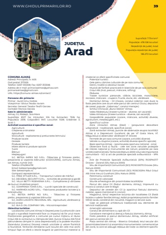 WWW.GHIDULPRIMARIILOR.RO 39Suprafa%u021b%u0103: 7.754 km%u00b2Popula%u021bie: 478.108 locuitoriRe%u0219edin%u021b%u0103 de jude%u021b: AradPopula%u021bia re%u0219edin%u021bei de jude%u021b: 185.272 locuitoriJUDE%u021aULAradCOMUNA ALMA%u015eAdres%u0103: Principal%u0103, nr. 605Cod po%u0219tal: 317005Telefon: 0257-313308; Fax: 0257-313308; Adresa de e-mail: primariaalmas@yahoo.comprimariaalmas@gmail.comURL: https://comuna-almas.ro/contact/Persoane din primarie:Primar : Aurel Ginu CosteaViceprimar: Silvius Teodor AvramSecretar General: Teodor-Teofil OarceaContabil: Monica OarceaSate %u00een administra%u021bie:Alma%u015f, Cil, R%u0103de%u015fti, Joia MareSuprafa%u021ba:%u00a0 8127 ha; Intravilan:%u00a0 516 ha; Extravilan:%u00a0 7616 ha; Popula%u021bia:%u00a0 2518; Gospod%u0103rii:%u00a0 847; Locuin%u021be:%u00a0 1028; Gr%u0103dini%u021be:%u00a0 3; %u0218coli:%u00a01; Activitati economice si specifice zonei:Agricultur%u0103Cre%u015fterea animalelorApicultur%u0103Silvicultur%u0103 - exploatarea %u015fi prelucrarea lemnuluiProduse locale: CerealeProduse lactateMiere albine %u0219i produse apicole%u0162uic%u0103Bl%u0103nuriMe%u015fte%u015fugari: S.C. BETEA IMPEX NO S.R.L. -T%u0103bacirea %u015fi finisarea pieilor, prepararea %u015fi vopsirea bl%u0103nurilor%u00a0 (COJOC%u0102RIE), comuna Alma%u0219, sat Alma%u0219, num%u0103r 240Telefon 0742904791Email: beteaimpex@gmail.comSite: beteaimpex.ro Companii reprezentative: S.C. FREE STYLER S.R.L. - Transporturi rutiere de m%u0103rfuri S.C. DECEBAL SECURITY S.R.L. - Activit%u0103%u0163i de protec%u0163ie %u015fi gard%u0103 S.C. VILLA BETTY ROEMENIA S.R.L. - Cump%u0103rarea %u015fi v%u00e2nzarea de bunuri imobiliare proprii S.C. COMPANIA TOMA S.R.L. - Lucr%u0103ri speciale de construc%u0163ii S.C. MARIMEX AGRO S.R.L. - Fabricarea produselor lactate %u015fi a br%u00e2nzeturilor S.C. BETEA IMPEX NO S.R.L. - T%u0103bacirea %u015fi finisarea pieilor,%u00a0prepararea %u015fi vopsirea bl%u0103nurilorS.C. AGRO LOGISTIC REGIONAL SRL - Agricultur%u0103, v%u00e2n%u0103toare %u015fi servicii anexe S.C. B.A.D. OIL COMPANY SRL - MicrointreprinderiObiective turistice:Localizarea comunei Alma%u0219 %u00een Depresiunea Gurahon%u021b din care ocup%u0103 o suprafa%u021b%u0103 %u00eensemnat%u0103 face ca impactul s%u0103 fie unul mare. Pozi%u021bionarea geografic%u0103 a comunei pe cursul mijlociu al r%u00e2ului Cri%u0219ul Alb la contactul cu C%u00e2mpia de Vest, (lunca Cri%u0219ului Alb fiind p%u0103trunderea c%u0103mpiei %u00een zona depresionar%u0103) %u0219i la poalele Mun%u021bilor Zarandului (masivul Drocea) creaz%u0103 unicitate %u0219i valore floristic%u0103 %u0219i faunistic%u0103. Teritoriile Alm%u0103%u0219ene sunt locuite din cele mai vechi timpuri fapt ce ofer%u0103 o istorie bogat%u0103 iar patrimoniul material %u0219i imaterial ce ofer%u0103 specificitate comuneiPoten%u021bial turistic:Cele patru c%u0103mine culturale de pe raza comuneiDatini, tradi%u021bii %u0219i obiceiuri localeMuzic%u0103 de fanfar%u0103 practicat%u0103 %u00een bisericile de pe raza comuneiCri%u0219ul Alb (%u00eenot, pescuit, m%u00e2ncare, rafting)P%u0103dureaTrasee turistice: pietonale, c%u0103l%u0103rie, biciclete, motociclete, recreere, m%u00e2ncare %u2013 ciuperci, fructe, alune, etc. v%u00e2n%u0103toareDomeniul Almay %u2013 Cil (moara, canalul colector care duce la fosta pesc%u0103rie care acum este parcul din centrul Cilului, depozitul de cereal, popular %u201eGabana%u0219u%u201d, canalul menajer)Schitul Chinovial %u201eBuna Vestire%u201d Alma%u0219Valea R%u0103de%u0219tiului (trasee turistice %u2013 diverse, sat vacan%u021b%u0103)Valea Alma%u0219ului (trasee turistice %u2013 diverse, sat vacan%u021b%u0103)Gospod%u0103riile popula%u021biei (cazare, m%u00e2ncare, activit%u0103%u021bi diverse, agroturism, me%u0219te%u0219ug%u0103rit, etc.)Specificul culinarZona intravilan Alma%u0219 (Deal) %u2013 (propunere dezvoltare urbanistic%u0103 %u2013 tradi%u021bional%u0103, specific%u0103 zonei)Zon%u0103 extravilan Alma%u0219, puncte de observa%u021bie asupra localit%u0103%u021bii Alma%u0219 %u0219i a Depresiunii Gurahon%u021b de pe: Vf Costa Mare, Vf. M%u0103gureaua %u0219i observator v%u00e2n%u0103toare Vf. DroceaFermele de pe raza comunei (cazare, activit%u0103%u021bi diverse)Vetrele cu stupine (cazare, activit%u0103%u021bi diverse specific apicole)Baze sportive Alma%u0219 %u2013 (promovarea sportului na%u021bional - oina)Observare flor%u0103 %u0219i faun%u0103 - cele trei zone naturale protejate de interes na%u0163ional %u015fi monumente ale naturii, prezente pe raza Unit%u0103%u021bii Administrativ Teritoriale (Natura 2000: situri de importan%u021b%u0103 comunitar%u0103 %u2013 SCI %u0219i arii de protec%u021bie special%u0103 avifaunistic%u0103 %u2013 SPA etc.):Arie de Protec%u021bie Special%u0103 Avifaunistic%u0103 (SPA)%u00a0 ROSPA0117 Drocea %u2013 Zarand (Situ Natura 2000)Situ de Importan%u021b%u0103 Comunitar%u0103 (SCI) ROSCI0070 Drocea%u00a0(Situ Natura 2000)Situ de Importan%u021b%u0103 Comunitar%u0103 (SCI) ROSCI0294 R%u00e2ul Cri%u0219ul Alb %u00eentre Ineu %u0219i Gurahon%u021b%u00a0(Situ Natura 2000)Patrimoniu construitConstruc%u021bii valoroaseSiturile arheologice din proximitatea localit%u0103%u021bilorParcul din satul Cil (fostul domeniu Almay), %u00eempreun%u0103 cu moara %u0219i canalul care le leag%u0103Depozitul de cereale din Cil (a apar%u021binut fostului domeniu nobiliar, apare men%u021bionat %u00een cronici)Magazinul, birtul respective locuin%u021ba din localitatea Cil (fost%u0103 loca%u021bie a rudelor familiei Almay). Ast%u0103zi proprietate privat%u0103 a familiei Mihe%u021b Iacob, const%u00e2nd din: locuin%u021b%u0103, magazin %u0219i service-autoCase ce p%u0103straz%u0103 arhitectura tradi%u021bional%u0103 sau elemente de tehnic%u0103 tradi%u021bional%u0103Amenaj%u0103ri valoroaseCanalul de alimentare cu ap%u0103 din CilCanalizare menajer%u0103 %u0219i drenaj a fostului domeniu AlmayFosta pesc%u0103rie %u0219i parcul domeniului Almay, relieful artificial din p