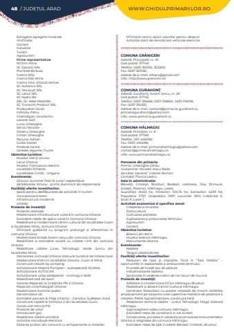 48 / JUDE%u021aUL ARAD WWW.GHIDULPRIMARIILOR.ROExtragere agregate mineraleVinifica%u021bie Comer%u021bIndustrieTurismAgroturismFirme reprezentative:SCDVV Mini%u0219SC Daiconi SRLPivni%u021bele Bir%u0103ua%u0219Crama MiloCrama Rab WineCrama Vino Viticola VeritasSC Avisanco SRLSC Terracult SRLSC Lanul SRLSC Hydro BGSRL SC West MeatSRLSC Transcim Product SRLProduc%u0103tori locali:Indric%u0103u PetruChelm%u0103gan ConstantinLeicere IosifLuciu GheorgheSarvici NicolaeOloieru GheorgheCrihan GheorghePacurar AdrianCulda DanielProduse locale: Cereale, legume, fructe Obiective turistice:Muzeul Viei %u015fi VinuluiLacul GhiorocMuzeul Tramvaiului electricLocalit%u0103%u021bii %u00cenfr%u0103%u021bite: Localitatea GYOD - UngariaEvenimente:Ghioroc Summer Fest 15 iunie 1 septembrie S%u0103rb%u0103toarea Vinului - prima duminic%u0103 din septembrieFacilit%u00e3%u0163i oferite investitorilor:Spa%u021bii pentru desf%u0103%u0219urarea de activit%u0103%u021bi %u00een turismConcesionare terenInfrastructur%u0103%u00a0modern%u0103Utilit%u0103%u021biProiecte de investi%u0163ii:Proiecte realizate:Modernizare infrastructur%u0103 rutier%u0103 %u00een comuna GhiorocExtindere re%u021bele de ap%u0103 %u0219i canal %u00een Comuna GhiorocReabilitare %u0219i modernizare c%u0103min cultural din localitatea Cuvin %u0219i localitatea Mini%u0219, comuna Ghioroc%u00cenfiin%u021bare gr%u0103dini%u021b%u0103 cu program prelungit %u0219i afterschool %u00een comuna GhiorocModernizare strada Avram Iancu din comuna GhiorocReabilitare %u0219i extindere %u0219coal%u0103 cu clasele I-VIII din comuna GhiorocReabilitare cl%u0103dire Liceu Tehnologic Vasile Juncu din localitatea Mini%u0219Declararea comunei Ghioroc sta%u021biune turistic%u0103 de interes localModernizare str%u0103zi %u00een localit%u0103%u021bile Ghioroc, Cuvin %u0219i Mini%u0219Construire c%u0103su%u021be tip campingAchizi%u021bionare Ma%u0219in%u0103 Pompieri - autospecial%u0103 SCANIAAchizi%u021bionare AUTOCARAchizi%u021bionare utilaj dez%u0103pezire - Unimog U 1600Reabilitare sal%u0103 de sportColonie Repara%u021bii la Gr%u0103dini%u021ba PN 2 GhiorocRepara%u021bii Cinematograf GhiorocModernizare iluminat publicDecolmatare v%u0103iExtindere parcare la Plaja Ghioroc - Consiliul Jude%u021bean AradConstruire capel%u0103 la Cimitirul 2 din localitatea CuvinConstruire remiza PSIProiecte de viitor:Introducere gazReabilitare cl%u0103dire prim%u0103rieAchizi%u021bie microbuze electriceDotarea %u0219colilor din comun%u0103%u00a0cu echipamente %u0219i mobilier%u00cenfiin%u021bare centru aport voluntar pentru de%u0219euriAchizi%u021bie sta%u021bii de re%u00eenc%u0103rcare vehicule electriceCOMUNA GR%u0102NICERIAdres%u0103: Principal%u0103, nr. 10Cod po%u0219tal: 317140Telefon: 0257-353150, 353200; Fax: 0257-353150; Adresa de e-mail: ottlaca@gmail.comURL: http://www.graniceri.ro/COMUNA GURAHON%u0162Adres%u0103: Gurahon%u021b, Avram Iancu, nr. 29Cod po%u0219tal: 317145Telefon: 0257-316558, 0257-316602, 0257-316108; Fax: 0257-316335; Adresa de e-mail: contact@primaria-gurahont.ro,primariagurahont@yahoo.comURL: www.primaria-gurahont.roCOMUNA H%u0102LMAGIU Adres%u0103: Prim%u0103riei, nr. 9Cod po%u0219tal: 317160Telefon: 357-405092; Fax: 0357-405096; Adresa de e-mail: primariahalmagiu@yahoo.comcontact@primariahalmagiu.roURL: www.primariahalmagiu.roPersoane din primarie:Primar: Gheorghe D%u0103r%u0103uViceprimar: Nicolae Voicu%u00a0Rada%u00a0Secretar General :%u00a0Gabriel%u00a0RomanContabil: Florica%u00a0LeahuSate %u00een administra%u021bie:B%u0103ne%u015fti, Criste%u015fti, Brusturi, Bode%u015fti, Lestioara, Tisa, %u0162%u0103rmure, Ione%u015fti, Poienari, H%u0103lmagiu, LeasaSuprafa%u021ba:%u00a0 8403 ha; Intravilan:%u00a0 516,76 ha; Extravilan:%u00a0 4239 ha; Popula%u021bia:%u00a0 3757; Gospod%u0103rii:%u00a0 1097; Locuin%u021be:%u00a0 1810; Gr%u0103dini%u021be:%u00a0 5; %u0218coli:%u00a09; Licee:%u00a01; Activitati economice si specifice zonei:Cre%u015fterea animalelorPomicultur%u0103Cultivarea plantelorExploatarea %u015fi prelucrarea lemnuluiAgroturismComer%u0163Obiective turistice:Biserici din lemnMuzeul bisericii H%u0103lmagiuMonumente istoriceEvenimente:NedeileT%u00e2rguri s%u0103pt%u0103m%u00e2naleFacilit%u00e3%u0163i oferite investitorilor:Reduceri de taxe %u015fi impozite, fiind %u00een %u201c%u0162ara Mo%u0163ilor%u201d - oportunit%u0103%u0163i %u00een exploatarea %u015fi prelucrarea lemnuluiFructele de livad%u0103 sau de p%u0103dureIndustrializarea lapteluiSprijinirea %u00een vederea cre%u0103rii de noi locuri de munc%u0103Proiecte de investi%u0163ii:Asfaltare %u0219i modernizare DC44 H%u0103lmagiu-BrusturiReabilitare %u0219i dotare C%u0103min Cultural H%u0103lmagiuGenerator fotovoltaic cu putere instalat%u0103 de maxim 400KWp amplasament pe %u0219arpanta unei copertine metalice de protec%u021bie a meselor Pie%u021bei Agroalimentare, construire Hal%u0103Reabilitare termic%u0103 cl%u0103dire - Liceul Tehnologic Moga Voievod H%u0103lmagiuSupraveghere video comuna H%u0103lmagiuExtindere re%u021bea de canalizare %u00een sat Ione%u0219tiConservarea, punerea %u00een valoare %u0219i promovarea monumentelor istorice %u0219i religioase din comuna H%u0103lmagiuExtindere re%u021bea de ap%u0103 %u00een satele B%u0103ne%u0219ti, Criste%u0219ti, Brusturi