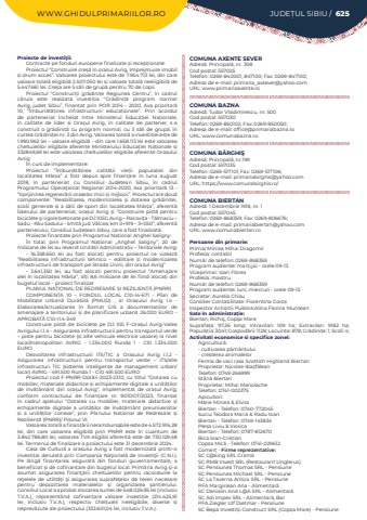WWW.GHIDULPRIMARIILOR.RO JUDE%u021aUL SIBIU / 625Proiecte de investi%u0163ii:Contracte pe fonduri europene finalizate %u0219i recep%u021bionate: Proiectul %u201cConstruire cre%u0219%u0103 %u00een ora%u0219ul Avrig, %u00eemprejmuire imobil %u0219i drum acces%u201d. Valoarea proiectului este de 7.954.713 lei, din care valoare total%u0103 eligibil%u0103 2.507.050 lei %u0219i valoare total%u0103 neeligibil%u0103 de 5.447.661 lei. Cre%u0219a are 5 s%u0103li de grup%u0103 pentru 70 de copiiProiectul %u201cConstruc%u021bii gr%u0103dini%u021be Regiunea Centru%u201d, %u00een cadrul c%u0103ruia este realizat%u0103 investi%u021bia %u201cGr%u0103dini%u021b%u0103 program normal Avrig, jude%u021b Sibiu%u201d, finan%u021bat prin POR 2014 - 2020, Axa prioritar%u0103 10, %u201c%u00cembun%u0103t%u0103%u021birea infrastructurii educa%u021bionale%u201d. Prin acordul de parteneriat %u00eencheiat %u00eentre Ministerul Educa%u021biei Na%u021bionale, %u00een calitate de lider %u0219i Ora%u0219ul Avrig, %u00een calitate de partener, s-a construit o gr%u0103dini%u021b%u0103 cu program normal, cu 3 s%u0103li de grup%u0103, %u00een curtea Gr%u0103dini%u021bei nr. 3 din Avrig. Valoarea total%u0103 a investi%u021biei este de 1.990.962 lei %u2013 valoare eligibil%u0103 - din care 1.658.113 lei este valoarea cheltuielilor eligibile aferente Ministerului Educa%u021biei Na%u021bionale %u0219i 332849,69 lei este valoarea cheltuielilor eligibile aferente Ora%u0219ului Avrig%u00cen curs de implementare:Proiectul %u201d%u00cembun%u0103t%u0103%u021birea calit%u0103%u021bii vie%u021bii popula%u021biei din localitatea M%u00e2r%u0219a%u201d a fost depus spre finan%u021bare %u00een luna august 2018, %u00een parteneriat cu Consiliul Jude%u021bean Sibiu, %u00een cadrul Programului Opera%u0163ional Regional 2014-2020, Axa prioritar%u0103 13 - %u201cSprijinirea regener%u0103rii ora%u0219elor mici %u0219i mijlocii%u201d. Proiectul are dou%u0103 componente: %u201dReabilitarea, modernizarea %u015fi dotarea gr%u0103dini%u021bei, %u0219colii generale %u0219i a s%u0103lii de sport din localitatea M%u00e2r%u0219a%u201d, aferent%u0103 liderului de parteneriat, ora%u0219ul Avrig %u0219i %u201dConstruire pist%u0103 pentru biciclete %u015fi rigole betonate pe DJ 105G Avrig %u2013 Racovi%u0163a - T%u0103lmaciu %u2013 Sadu - R%u00e2u Sadului - limit%u0103 jud. V%u00e2lcea, km 0+919 %u2013 3+050%u201d, aferent%u0103 partenerului, Consiliul Jude%u021bean Sibiu, care a fost finalizat%u0103.Proiecte finan%u021bate prin Programul Na%u021bional Anghel Saligny:%u00cen total, prin Programul Na%u021bional %u201eAnghel Saligny%u201d, 20 de milioane de lei au revenit Unit%u0103%u021bii Administrativ %u2013 Teritoriale Avrig:- 16.358,650 lei au fost aloca%u021bi pentru proiectul ce vizeaz%u0103 %u201cReabilitarea infrastructurii tehnico %u2013 edilitare %u0219i modernizarea infrastructurii de transport pe Strada Unirii, din ora%u0219ul Avrig%u201d- 3.641,350 lei, au fost aloca%u021bi pentru proiectul %u201cAmenajare alei %u00een localitatea M%u00e2r%u0219a%u201d, al%u021bi 8,6 milioane de lei fiind aloca%u021bi din bugetul local. - proiect finalizatPLANUL NA%u021aIONAL DE REDRESARE %u0218I REZILIEN%u021a%u0102 (PNRR)COMPONENTA 10 %u2013 FONDUL LOCAL C10-I4-671 - Plan de Mobilitate Urban%u0103 Durabil%u0103 (PMUD) , al Ora%u0219ului Avrig I.4 - Elaborarea/actualizarea %u00een format GIS a documenta%u021biilor de amenajare a teritoriului %u0219i de planificare urban%u0103 26.000 EURO - APROBAT%u0102 C10-I1.4-349Construire pist%u0103 de biciclete pe DJ 105 F-Ora%u0219ul Avrig-Valea Avrigului I.1.4 - Asigurarea infrastructurii pentru transportul verde %u2013 piste pentru biciclete (%u0219i alte vehicule electrice u%u0219oare) la nivel local/metropolitan AVRIG - 1.334.000 Runda 1 - C10 1.334.000 EURODezvoltarea infrastructurii ITS/TIC a Ora%u0219ului Avrig I.1.2 - Asigurarea infrastructurii pentru transportul verde %u2013 ITS/alte infrastructuri TIC (sisteme inteligente de management urban/local) AVRIG - 491.500 Runda 1 - C10 491.500 EUROProiectul cod F-PNRR-Dot%u0103ri-2023-2310, cu titlul %u201cDotarea cu mobilier, materiale didactice %u0219i echipamente digitale a unit%u0103%u021bilor de %u00eenv%u0103%u021b%u0103m%u00e2nt din ora%u0219ul Avrig%u201d, implementat de ora%u0219ul Avrig, conform contractului de finan%u021bare nr. 901DOT/2023, finan%u021bat %u00een cadrul apelului %u201cDotarea cu mobilier, materiale didactice %u0219i echipamente digitale a unit%u0103%u021bilor de %u00eenv%u0103%u021b%u0103m%u00e2nt preuniversitar %u0219i a unit%u0103%u021bilor conexe%u201d, prin Planului Na%u021bional de Redresare %u0219i Rezilien%u021b%u0103 (PNRR)/ Pilonul VI.Valoarea total%u0103 a finan%u021b%u0103rii nerambursabile este de 4.572.916,28 lei, din care valoarea eligibil%u0103 prin PNRR este %u00een cuantum de 3.842.786,80 lei, valoarea TVA eligibil aferent%u0103 este de 730.129,48 lei. Termenul de finalizare a proiectului este 31 decembrie 2024. Casa de Cultur%u0103 a ora%u0219ului Avrig a fost modernizat%u0103 printr-o investi%u021bie derulat%u0103 prin Compania Na%u0163ional%u0103 de Investi%u0163ii (C.N.I.). Pe l%u00e2ng%u0103 finan%u021barea asigurat%u0103 din fonduri guvernamentale, a beneficiat %u0219i de cofinan%u021bare din bugetul local. Prim%u0103ria Avrig %u015fi-a asumat asigurarea finan%u0163%u0103rii cheltuielilor pentru racordurile la re%u0163elele de utilit%u0103%u0163i %u015fi asigurarea suprafe%u0163elor de teren necesare pentru depozitarea materialelor %u015fi organizarea %u015fantierului. Consiliul Local a aprobat alocarea sumei de 548.026,95 lei (inclusiv T.V.A.), reprezent%u00e2nd cofinan%u021bare valoare investi%u021bie (214.425,91 lei, inclusiv T.V.A.), respectiv cheltuieli neeligibile, diverse %u0219i neprev%u0103zute ale proiectului (333.601,04 lei, inclusiv%u00a0T.V.A.).COMUNA AXENTE SEVERAdres%u0103: Principal%u0103, nr. 308Cod po%u0219tal: 557025Telefon: 0269-840001, 847100; Fax: 0269-847100; Adresa de e-mail: primaria_axsever@yahoo.
