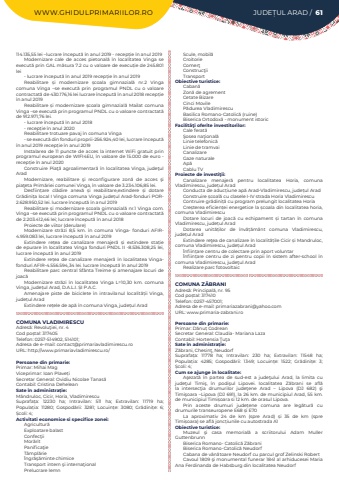 WWW.GHIDULPRIMARIILOR.RO JUDE%u021aUL ARAD / 61114.135,55 lei %u2013lucrare %u00eenceput%u0103 %u00een anul 2019 - recep%u021bie %u00een anul 2019Modernizare cale de acces pietonal%u0103 %u00een localitatea Vinga se execut%u0103 prin GAL m%u0103sura 7.2 cu o valoare de execu%u021bie de 245.801 lei-%u00a0lucrare %u00eenceput%u0103 %u00een anul 2019 recep%u021bie %u00een anul 2019Reabilitare %u0219i modernizare %u0219coala gimnazial%u0103 nr.2 Vinga comuna Vinga %u2013se execut%u0103 prin programul PNDL cu o valoare contractat%u0103 de 430.176,16 lei lucrare %u00eenceput%u0103 %u00een anul 2018 recep%u021bie %u00een anul 2019Reabilitare %u0219i modernizare %u0219coala gimnazial%u0103 Mailat comuna Vinga %u2013se execut%u0103 prin programul PNDL cu o valoare contractat%u0103 de 912.971,76 lei.-%u00a0lucrare %u00eenceput%u0103 %u00een anul 2018- recep%u021bie %u00een anul 2020Reabilitare trotuare pavaj %u00een comuna Vinga- se execut%u0103 din fonduri proprii-256.924,40 lei, lucrare %u00eenceput%u0103 %u00een anul 2019 recep%u021bie %u00een anul 2019Instalarea de 11 puncte de acces la internet WiFi gratuit prin programul european de WIFI4EU, %u00een valoare de 15.000 de euro - recep%u021bie %u00een anul 2020Construire Pia%u0163%u0103 agroalimentar%u0103 %u00een localitatea Vinga, jude%u0163ul AradModernizare, reabilitare %u015fi reconfigurare zon%u0103 de acces %u015fi pia%u0163eta Prim%u0103riei comunei Vinga, %u00een valoare de 3.234.106,85 lei.Desfiin%u021bare cl%u0103dire anex%u0103 %u0219i reabilitare,extindere %u0219i dotare Gr%u0103dini%u021ba local I Vinga comuna Vinga jude%u021bul Arad-fonduri POR2.628.950,52 lei. lucrare %u00eenceput%u0103 %u00een anul 2019Reabilitare %u0219i modernizare %u0219coala gimnazial%u0103 nr.1 Vinga com.Vinga %u2013se execut%u0103 prin programul PNDL cu o valoare contractat%u0103 de 2.203.412,46 lei; lucrare %u00eenceput%u0103 %u00een anul 2018Proiecte de viitor (derulare)Modernizare str%u0103zi 8,5 km. %u00een comuna Vinga- fonduri AFIR4.959.083 lei, lucrare %u00eenceput%u0103 %u00een anul 2019Extindere re%u021bea de canalizare menajer%u0103 %u0219i extindere sta%u021bie de epurare %u00een localitatea Vinga fonduri PNDL II -8.536.308,25 lei, lucrare %u00eenceput%u0103 %u00een anul 2019Extindere re%u021bea de canalizare menajer%u0103 %u00een localitatea Vingafonduri AFIR-4.556.594,34 lei. lucrare %u00eenceput%u0103 %u00een anul 2019Reabilitare parc central Sf%u00e2nta Treime %u0219i amenajare locuri de joac%u0103Modernizare str%u0103zi %u00een localitatea Vinga L=10,30 km. comuna Vinga, jude%u021bul Arad, D.A.L.I. %u0218I P.A.C.Amenajare piste de biciclete %u00een intravilanul localit%u0103%u021bii Vinga, jude%u021bul AradExtindere re%u021bele de ap%u0103 %u00een comuna Vinga, jude%u021bul AradCOMUNA VLADIMIRESCUAdres%u0103: Revolu%u0163iei, nr. 4Cod po%u0219tal: 317405Telefon: 0257-514902, 514101; Adresa de e-mail: contact@primariavladimirescu.roURL: http://www.primariavladimirescu.ro/Persoane din primarie:Primar: Mihai MagViceprimar: Ioan Plave%u021biSecretar General: Ovidiu Nicolae Tanas%u0103Contabil: Cristina DeheleanSate %u00een administra%u021bie:M%u00e2ndruloc, Cicir, Horia, VladimirescuSuprafa%u021ba:%u00a0 12230 ha; Intravilan:%u00a0 511 ha; Extravilan:%u00a0 11719 ha; Popula%u021bia:%u00a0 11280; Gospod%u0103rii:%u00a0 3281; Locuin%u021be:%u00a0 3080; Gr%u0103dini%u021be:%u00a0 6; %u0218coli:%u00a04; Activitati economice si specifice zonei:Agricultur%u0103Exploatare balastConfec%u0163iiMor%u0103ritPanifica%u0163ieT%u00e2mpl%u0103rie%u00cengr%u0103%u015f%u0103minte chimiceTransport intern %u015fi interna%u0163ionalPrelucrare lemnScule, mobil%u0103CroitorieComer%u0163Construc%u0163iiTransport%u00a0Obiective turistice:Caban%u0103Zon%u0103 de agrementCetate BizareCinci MovileP%u0103durea VladimirescuBasilica Romano-Catolic%u0103 (ruine)Biserica Ortodox%u0103 - monument istoricFacilit%u00e3%u0163i oferite investitorilor:Cale ferat%u0103%u015eosea na%u0163ional%u0103Linie telefonic%u0103Linie de tramvaiCanalizareGaze naturaleAp%u0103Cablu TVProiecte de investi%u0163ii:Canalizare menajer%u0103 pentru localitatea Horia, comuna Vladimirescu, jude%u021bul AradConducta de aduc%u021biune ap%u0103%u00a0Arad-Vladimirescu, jude%u021bul AradConstruire %u0219coal%u0103%u00a0cu clasele I-IV strada Horia Vladimirescu%u00a0Contruire gr%u0103dini%u021b%u0103%u00a0cu program prelungit localitatea HoriaCre%u0219terea eficien%u021bei energetice la %u0219coala din localitatea horia, comuna VladimirescuDotare locuri de joac%u0103%u00a0 cu echipament %u0219i tartan %u00een comuna Vladimirescu, jude%u021bul AradDotarea unit%u0103%u021bilor de %u00eenv%u0103%u021b%u0103m%u00e2nt comuna Vladimirescu, jude%u021bul AradExtindere re%u0163ea de canalizare %u00een localit%u0103%u021bile Cicir %u0219i Mandruloc, comuna Vladimirescu, jude%u021bul Arad%u00cenfiin%u021bare centru de colectare prin aport voluntar%u00cenfiin%u021bare centru de zi pentru copii %u00een sistem after-school %u00een comuna Vladimirescu, jude%u0163ul AradRealizare parc fotovoltaicCOMUNA Z%u0102BRANIAdres%u0103: Principal%u0103, nr. 95Cod po%u0219tal: 317410Telefon: 0257-457001; Adresa de e-mail: primariazabrani@yahoo.comURL: www.primaria-zabrani.roPersoane din primarie:Primar: D%u0103nu%u021b CodreanSecretar General: Claudia- Mariana LazaContabil: Hortensia %u0162u%u0163aSate %u00een administra%u021bie:Z%u0103brani, Chesin%u0163, NeudorfSuprafa%u021ba:%u00a0 11778 ha; Intravilan:%u00a0 230 ha; Extravilan:%u00a0 11548 ha; Popula%u021bia:%u00a0 4285; Gospod%u0103rii:%u00a0 1349; Locuin%u021be:%u00a0 1522; Gr%u0103dini%u021be:%u00a0 3; %u0218coli:%u00a04; Cum se ajunge in localitate:A%u015fezat%u0103 %u00een partea de sud-est a jude%u0163ului Arad, la limita cu jude%u0163ul Timi%u015f, %u00een podi%u015ful Lipovei. localitatea Z%u0103brani se afl%u0103 la intersec%u0163ia drumurilor jude%u0163ene Arad %u2013 Lipova (DJ 682) %u015fi Timi%u015foara %u2013Lipova (DJ 691), la 26 km. de municipiul Arad, 55 km. de m