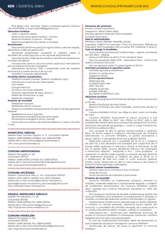 630 / JUDE%u021aUL SIBIU WWW.GHIDULPRIMARIILOR.RO PFA Balan Iulia -Cornelia -Miere %u0219i produse apicole .Contact :Tel. 0743791831, e-mail: iuliatrif82@yahoo.comObiective turistice:Case cu specific s%u0103sescBiseric%u0103 din lemn greco-catolic%u0103 - IlimbavBiseric%u0103 ortodox%u0103 cu picturi - Ilimbav Biseric%u0103 evanghelic%u0103 tip cetate, %u00een MarpodEvenimente:Dezvoltarea de ferme, pensiuni agroturistice, case de oaspe%u021bi, dezvoltare unit%u0103%u021bi de agroturismAccesarea programelor europene %u00een vederea cre%u0103rii %u0219i devolt%u0103rii de unit%u0103%u021bi agricole %u0219i non agricole de produc%u021bieDezvoltarea de unit%u0103%u021bi de procesare %u0219i valorificare superioar%u0103 a fructelor de p%u0103dureIntroducerea zonei %u00een circuitul turistic na%u021bional %u0219i interna%u021bional prin accesarea de fonduri europeneDezvoltarea sectorului IMM o poten%u021bial%u0103 surs%u0103 de cre%u0219tere economic%u0103 %u0219i creare de locuri de munc%u0103 Investi%u021bii %u00een energie regenerabil%u0103Facilit%u00e3%u0163i oferite investitorilor:Telefonie mobil%u0103 (Orange, Telekom ,Vodafone, Digi )Televiziune %u0219i internet prin fibr%u0103%u00a0optic%u0103Gaz metanEnergie electric%u0103Drumuri comunale asfaltateDistan%u021ba redus%u0103%u00a0fa%u021b%u0103%u00a0de Sibiu (30 km )Re%u021bele de Alimentare cu ap%u0103Re%u021bele de canalizareProiecte de investi%u0163ii:Reabilitare trotuareReabilitare C%u0103min CulturalDotare cu mobilier %u0219i echipamente TIC pentru %u0218coala general%u0103 MarpodReabilitare drumuri agricole Eficientizare energetic%u0103 %u0219coala gimnazial%u0103Eficientizare energetic%u0103 c%u0103min cultural Contruirea unui centru de colectare de%u0219euri cu aport voluntar ( CAV)MUNICIPIUL MEDIA%u015eAdres%u0103: Pia%u0163a Corneliu Coposu nr. 3; Cod po%u0219tal: 551018Telefon: 0269-803803, 803800; Fax: 0269-841198; Adresa de e-mail: primaria@primariamedias.roURL: www.primariamedias.roCOMUNA MERGHINDEALAdres%u0103: Principal%u0103, nr. 60Cod po%u0219tal: 557140Telefon: 0269-517501, 517505; Fax: 0269-517501; Adresa de e-mail: primariamerghindeal@yahoo.comURL: www.primariamerghindeal.roCOMUNA MIC%u0102SASAAdres%u0103: 1 Decembrie 1918, nr. 144; Cod po%u0219tal: 557145Telefon: 0374-062141, 063272; Fax: 0374-094848; Adresa de e-mail: contact@primaria-micasasa.roprimar@primaria-micasasa.ro, pmicasasa@yahoo.comURL: https://primaria-micasasa.ro/ORA%u0218UL MIERCUREA SIBIULUIAdres%u0103: Ilie M%u0103celariu, nr. 48Cod po%u0219tal: 557150Telefon: 0269-533102; Fax: 0269-533124; Adresa de e-mail: primmsb@yahoo.comURL: http://www.miercureasibiului.roCOMUNA MIH%u0102ILENIAdres%u0103: Principal%u0103, nr. 165Cod po%u0219tal: 557155Telefon: 0269-254525; Fax: 0269-254633; Adresa de e-mail: primariamihailenisb@yahoo.comURL: https://comunamihailenisb.ro/Persoane din primarie:Primar: Cristian Ioan BratuViceprimar: Mihai C%u0103t%u0103lin BelaSecretar general: Iezsenski Dalma ErjsebetContabil: Elena BianSate %u00een administra%u021bie:Mih%u0103ileni, Meti%u015f, R%u0103v%u0103%u015fel, Moard%u0103%u015f, %u015ealc%u0103uSuprafa%u021ba:%u00a07768,77 ha; Intravilan:%u00a0173,41 ha; Extravilan:%u00a07595,36 ha; Popula%u021bia:%u00a01072; Gospod%u0103rii:%u00a0512; Locuin%u021be:%u00a0512; Gr%u0103dini%u021be:%u00a02; %u0218coli:%u00a02; Cum se ajunge in localitate:Comuna este situat%u0103 pe DJ 141 %u015eeica Mare %u2013 Agnita, care deriv%u0103 din DN Sibiu %u2013 Media%u015fComuna Mih%u0103ileni se afl%u0103 la 17 km de %u015eeica MareCea mai apropiat%u0103 sta%u0163ie CFR: %u2013 halta %u015eeica Mare %u2013 la 20 km de sediul Consiliului comunalCel mai apropiat spital: %u00een ora%u015ful Agnita, la 30 kmActivitati economice si specifice zonei:Activit%u0103%u021bi agricole %u0219i zootehniceComer%u021b%u00a0cu am%u0103nuntulMagazine s%u0103te%u0219tiFirme reprezentative:IRINCHES SRLALIANDYSONY SRLNATY RO SRLANDRE VLAD SRLHANER DSB SRLBLI RENO CONSTRUCT SRLObiective turistice:Biserica Evanghelic%u0103 fortificat%u0103%u00a0din R%u0103v%u0103%u0219el, construc%u021bie%u00a0secolul al XVI-leaBiserica fortificat%u0103%u00a0din satul%u00a0Meti%u0219Biserica fortificat%u0103%u00a0 din satul%u00a0 Moard%u0103%u0219, construc%u021bie%u00a0 secolul al XIV-leaCanionul Mih%u0103ileni%u00a0(15 ha) %u00a0sau R%u00e2pa lui Brot, cotat ca al doilea din %u021bar%u0103Canionul Mih%u0103ileni%u00a0 (monument al naturii cunoscut %u0219i sub denumirea de %u201eR%u00e2pa lui Brot%u201d sau%u00a0 %u201eP%u00e2r%u00e2ul lui Brot%u201d, este o arie protejat%u0103 de interes na%u021bional ce corespunde categoriei a III-a%u00a0IUCN%u00a0( rezerva%u021bie natural%u0103%u00a0de tip%u00a0geologic ) , situat %u00een sudul%u00a0Transilvaniei, pe teritoriul%u00a0jude%u021bului Sibiu.Aria natural%u0103 se afl%u0103 %u00een partea central-nordic%u0103 a jude%u021bului Sibiu (la limita sudic%u0103 a%u00a0 Podi%u0219ului H%u00e2rtibaciului), pe teritoriul administrativ al%u00a0 comunei Mih%u0103ileni, %u00een partea nord-estic%u0103 a satului%u00a0%u0218alc%u0103u, %u00een apropierea drumului jude%u021bean DJ141A. Rezerva%u021bia natural%u0103 (cu o suprafa%u021b%u0103 de 16 ha %u0219i o lungime de 0,60 ha) a fost declarat%u0103%u00a0arie protejat%u0103%u00a0prin%u00a0Legea Nr.5 din 6 martie 2000, publicat%u0103 %u00een%u00a0 Monitorul Oficial al Rom%u00e2niei, Nr.152 din 12 aprilie 2000, privind aprobarea%u00a0 Planului de amenajare a teritoriului na%u021bional %u2013 Sec%u021biunea a III-a %u2013 zone protejate%u00a0 %u00a0 %u00a0 %u0219i reprezint%u0103 un defileu (vale %u00eengust%u0103) cu versan%u021bi abrup%u021bi (alc%u0103tui%u021bi din%u00a0 sedimente%u00a0 pliocene) cu %u00een%u0103l%u021bimi de p%u00e2n%u0103 la 20-25 m. %u0219i o desf%u0103%u0219urare de 0,60 km; crea%u021bi %u00een urma eroziunii (sp%u0103lare, %u0219iroire)%u00a0 rocilor. Rezerva%u021bia se afl%u0103 %u00een malul st%u00e2ng al%u00a0 V%u0103ii Calvei%u00a0 %u0219i prezint%u0103 interes geologic %u0