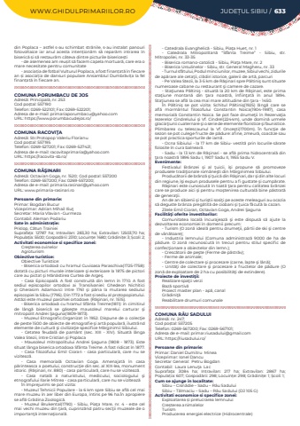 WWW.GHIDULPRIMARIILOR.RO JUDE%u021aUL SIBIU / 633din Poplaca %u2013 astfel s-au schimbat str%u0103nile, s-au instalat panouri fotovoltaice iar anul acesta inten%u021bion%u0103m s%u0103 repar%u0103m intrarea %u00een biseric%u0103 %u0219i s%u0103 restaur%u0103m c%u00e2teva dintre picturile biserice%u0219ti-%u00a0de asemenea am reu%u0219it s%u0103 facem capela mortuar%u0103, care era o mare necesitate pentru comunitate -%u00a0asocia%u021bia de fotbal Vulturul Poplaca, a fost finan%u021bat%u0103 %u00een fiecare an %u0219i asocia%u021bia de dansuri populare Ansamblul Dumbr%u0103vi%u021ba la fel finan%u021bat%u0103 %u00een fiecare an.COMUNA PORUMBACU DE JOSAdres%u0103: Principal%u0103, nr. 253Cod po%u0219tal: 557190Telefon: 0269-522101; Fax: 0269-522201; Adresa de e-mail: primariaporumbacu@yahoo.comURL: https://www.porumbacudejos.ro/COMUNA RACOVI%u0162AAdres%u0103: Str.Protopop Valeriu FlorianuCod po%u0219tal: 557195Telefon: 0269-527201; Fax: 0269-527421; Adresa de e-mail: racovitaprimaria@yahoo.comURL: https://racovita-sb.ro/COMUNA R%u0102%u015eINARIAdres%u0103: Octavian Goga, nr. 1520; Cod po%u0219tal: 557200Telefon: 0269-557200; Fax: 0269-557200; Adresa de e-mail: primaria.rasinari@yahoo.comURL: www.primaria-rasinari.roPersoane din primarie:Primar: Bogdan BucurViceprimar:%u00a0Adrian Mihail Iliu%u0163%u00a0%u00a0Secretar: Maria Vlavian -Gurmeza%u00a0Contabil: Aleman Podariu%u00a0Sate %u00een administra%u021bie:Prislop, C%u0103tun TrainieiSuprafa%u021ba:%u00a0 12787 ha; Intravilan:%u00a0 283,30 ha; Extravilan:%u00a0 12503,70 ha; Popula%u021bia:%u00a05500; Gospod%u0103rii:%u00a02310; Locuin%u021be:%u00a01680; Gr%u0103dini%u021be:%u00a03; %u0218coli:%u00a02; Activitati economice si specifice zonei:Cre%u015fterea ovinelorAgroturismObiective turistice:Obiective Turistice:- Biserica ortodox%u0103 cu hramul Cuvioasa Paraschiva(1725-1758): dotat%u0103 cu picturi murale interioare %u015fi exterioare la 1875 de pictori care au pictat %u015fi M%u0103n%u0103stirea Curtea de Arge%u015f.- Casa Episcopal%u0103. A fost construit%u0103 din lemn %u00een 1710. A fost sediul episcopilor ortodoxi ai Transilvaniei: Ghedeon Nichitici %u015fi Gherasim Adamovici %u00eentre 1761 %u015fi p%u00e2na la mutarea sediului episcopiei la Sibiu (1795). Din 1772 a fost %u0219i sediu al protopopiatului.Ast%u0103zi este muzeul parohiei ortodoxe. (R%u0103%u015finari, nr. 1515).- Biserica ortodox%u0103 cu hramul Sf%u00e2nta Treime(1811): %u00een cimitirul de l%u00e2ng%u0103 biseric%u0103 se g%u0103se%u015fte mausoleul marelui carturar %u015fi mitropolit Andrei %u015eaguna(1809-1873).- Muzeul Etnografic.Organizat %u00een 1952. Dispune de o colec%u0163ie de peste 1500 de obiecte de etnografie %u015fi art%u0103%u00a0popular%u0103, ilustr%u00e2nd elemente de cultur%u0103%u00a0%u015fi civiliza%u0163ie specifice M%u0103rginimii Sibiului.- Cetatea feudal%u0103 de pam%u00e2nt (sec. XIII - XIV). Situat%u0103%u00a0 l%u00e2nga Valea Stezii, %u00eentre Cristian %u015fi Poplaca- Mausoleul mitropolitului Andrei %u015eaguna (1808 - 1873). Este situat l%u00e2nga biserica ortodoxa Sf%u00e2nta Treime. A fost ridicat %u00een 1877.- Casa filozofului Emil Cioran - casa particular%u0103, care nu se viziteaz%u0103.- Casa memorial%u0103 Octavian Goga. Amenajat%u0103 %u00een casa p%u0103rinteasca a poetului, construc%u0163ie din sec. al XIX-lea, monument istoric. (R%u0103%u015finari, nr. 880) - casa particular%u0103, care nu se viziteaz%u0103.- Casa natal%u0103 a naturistului, medicului, sociologului %u015fi etnografului Ilarie Mitrea - casa particular%u0103, care nu se viziteaz%u0103%u00cen %u00eemprejurimi se pot vizita:- Muzeul Tehnicii Populare - la 6 km spre Sibiu se afl%u0103 cel mai mare muzeu %u00een aer liber din Europa, %u00eentins pe 96 ha.%u00cen apropiere se afl%u0103 Gr%u0103dina Zoologic%u0103.- Muzeul Brukental(1790) - Sibiu, Pia%u0163a Mare, nr. 4 - este cel mai vechi muzeu din %u0163ar%u0103, cuprinz%u00e2nd patru sec%u0163ii muzeale de o importan%u0163%u0103 interna%u0163ional%u0103.- Catedrala Evanghelic%u0103 - Sibiu, Pia%u0163a Huet, nr. 1- Catedrala Mitropolitan%u0103 %u201cSf%u00e2nta Treime%u201d - Sibiu, str. Mitropoliei, nr. 33-35%u00a0- Biserica romano-catolic%u0103 - Sibiu, Pia%u0163a Mare, nr. 2- Biserica Ursulinelor - Sibiu, str. General Magheru, nr. 33- Turnul sf%u00e2tului, Podul minciunilor, muzee, Sibiul vechi, zidurile de ap%u0103rare ale ceta%u0163ii, cl%u0103diri istorice, galerii de art%u0103, parcuri- Pe Valea Stezii, la 3-5 km de R%u0103%u015finari spre P%u0103ltini%u015f sunt situate numeroase cabane cu restaurant %u015fi camere de cazare.- Sta%u0163iunea P%u0103ltini%u015f - situat%u0103 la 20 km de R%u0103%u015finari, este prima sta%u0163iune montan%u0103 din %u0163ara noastr%u0103, %u00eenfiin%u0163at%u0103 %u00een anul 1894. Sta%u0163iunea se afl%u0103 la cea mai mare altitudine din %u0163ara - 1450.%u00cen P%u0103ltini%u015f se pot vizita: Schitul P%u0103ltini%u015f(1925) l%u00e2ng%u0103 care se afl%u0103 morm%u00e2ntul filosofului Constantin Noica(1904-1987), casa memorial%u0103 Constantin Noica. Se pot face drume%u0163ii %u00een Rezerva%u0163ia Iezerelor Cindrelului %u015fi Vf. Cindrel(2244m), unde domin%u0103%u00a0urmele glacia%u0163iunii cuaternare %u015fi o serie de elemente floristice %u015fi faunistice. Plimbarea cu telescaunul la Vf. Once%u015fti(1700m). %u00cen func%u0163ie de sezon se pot culege fructe de p%u0103dure: afine, zmeur%u0103, coac%u0103ze sau se pot practica sporturile de iarn%u0103.- Ocna Sibiului - la 17 km de Sibiu- vestit%u0103 prin locurile s%u0103rate folosite %u00een cura balnear%u0103.- Sadu - la 13 km de R%u0103%u015finari - se afl%u0103 prima hidrocentral%u0103 din %u0163ara noastr%u0103 1896 Sadu I, 1907 Sadu II, 1955 Sadu V.Evenimente:Festivalul Br%u00e2nzei %u015fi al %u0163uicii, %u00ee%u015fi propune s%u0103 promoveze produsele tradi%u0163ionale rom%u00e2ne%u015fti din M%u0103rginimea Sibiului.Produc%u0103torii de br%u00e2nz%u0103 %u015fi %u0163uic%u0103 din R%u0103%u015f