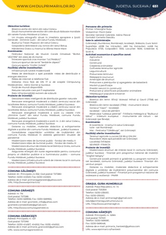 WWW.GHIDULPRIMARIILOR.RO JUDE%u021aUL SUCEAVA / 651Obiective turistice:Biserica veche din lemn din satul ColacuDou%u0103 monumente ale eroilor din cele dou%u0103 r%u0103zboaie mondiale din satele Fundu Moldovei %u0219i ColacuUn muzeu etnografic situat %u00een imediata apropiere a %u015ecolii Generale - Dimitrie Gusti - din satul Fundu Moldovei; -Bustul lui Traian Popovici din satul ColacuGospodaria %u021b%u0103r%u0103neasc%u0103 Li%u0163u Ionica din satul Botu%u015f M%u00e2n%u0103stirea Orata cu hramul la Sf%u00e2nta Marie MareEvenimente:Festivalul Na%u021bional de Muzic%u0103 Coral%u0103 Ortodox%u0103 %u201cBUNA VESTIRE%u201d din data de 25 martie%u00centrecere sportiv%u0103%u00a0cros montan %u201cULTRABUG%u201dConcurs sporturi de iarn%u0103%u00a0%u201dSerb%u0103rile z%u0103pezii%u201dConcurs sportiv %u201cCUPA 1 IUNIE%u201dFacilit%u00e3%u0163i oferite investitorilor:Infrastructur%u0103%u00a0rutier%u0103 modernizat%u0103Re%u021bea de distribu%u0163ie a apei potabile -re%u021bea de destribu%u021bie e energiei electriceRe%u021bea de internet %u0219i telefonie fix%u0103Distan%u0163a mica fa%u0163%u0103 de DN 17 %u0219i de ora%u015fele C%u00e2mpulung Moldovenesc , Vatra Dornei %u015fi SuceavaFor%u021b%u0103 de munc%u0103 disponibil%u0103Resurse naturale care pot fi exploatateRata infrac%u0163ionalit%u0103%u021bii extrem de sc%u0103zut%u0103Proiecte de investi%u0163ii:Dezvoltare re%u021bea inteligent%u0103%u00a0de distribu%u021bie gazelor naturaleRenovare energetic%u0103%u00a0 moderat%u0103%u00a0 a cl%u0103dirii centrului social din localitatea Botus, comuna Fundu Moldovei, jude%u021bul SuceavaRenovare energetic%u0103%u00a0 moderat%u0103%u00a0 a cl%u0103dirii centrului social din localitatea Botus, comuna Fundu Moldovei, jude%u021bul SuceavaRenovare energetic%u0103 moderat%u0103 a %u0219colii cu clasele I-VIII %u201eDimitrie Gusti%u201d din satul Fundu Moldovei, comuna Fundu Moldovei, jude%u021bul SuceavaRenovare energetic%u0103 moderat%u0103 a %u0219colii nr. 2 din satul Colacu, comuna Fundu Moldovei, jude%u021bul SuceavaDotarea cu mobilier, materiale didactice %u0219i echipamente digitale a %u0219colilor din comuna Fundu Moldovei , jude%u021bul SuceavaConsolidarea capacit%u0103%u021bilor unit%u0103%u021bilor de %u00eenv%u0103%u021b%u0103m%u00e2nt din comuna Fundu Moldovei %u00een vederea gestion%u0103rii situa%u021biei de pandemieModernizare re%u021bea de iluminat public - fondul de mediu IIModernizare re%u021bea de iluminat public - fondul de mediu IIIModernizare drumuri de interes local Delni%u021ba %u0219i Orata, comuna Fundu Moldovei, jude%u021bul SuceavaAsigurarea energiei din surse regenerabile pentru consumul propriu al cl%u0103dirilor publice si a iluminatului public %u2013 comuna Fundu Moldovei, jude%u021bul SuceavaModernizare infrastructur%u0103 rutier%u0103 de interes local %u00een comuna Fundu Moldovei, jude%u021bul SuceavaCOMUNA G%u0102L%u0102NE%u015eTIAdres%u0103: str. Principala ,nr.352; Cod po%u0219tal: 727280Telefon: 0230-412320; Fax: 0230-412320; Adresa de e-mail: primariagalanesti@yahoo.comURL: http://www.eprimarii.ro/COMUNA GR%u0102ME%u015eTIAdres%u0103: nr. 116Cod po%u0219tal: 727285Telefon: 0230-569955; Fax: 0230-569955; Adresa de e-mail: gramesti_info@yahoo.comgramesti.contabilitate@gmail.comURL: http://www.comunagramesti.roCOMUNA GR%u0102NICE%u015eTIAdres%u0103: Principal%u0103, nr. 421Cod po%u0219tal: 727290Telefon: 0230-414557, 414552; Fax: 0230-414552; Adresa de e-mail: primarie_granicesti@yahoo.comURL: www.comunagranicesti.roPersoane din primarie:Primar: Gheorghe Nu%u0163uViceprimar: Florin %u0218alar%u00a0Secretar General: Gabriela- Adina PascalContabil: Camelia Dasc%u0103luSate %u00een administra%u021bie:Gr%u0103nice%u015fti, Dumbrava, Rom%u00e2ne%u015fti, Iacobe%u015fti, Slobozia, Gura SolciiSuprafa%u021ba:%u00a0 4938 ha; Intravilan:%u00a0 480 ha; Extravilan:%u00a0 4458 ha; Popula%u021bia:%u00a0 5725; Gospod%u0103rii:%u00a0 1355; Locuin%u021be:%u00a0 1606; Gr%u0103dini%u021be:%u00a0 6; %u0218coli:%u00a06; Activitati economice si specifice zonei:Agricultur%u0103IndustrieConstruc%u0163iiCre%u015fterea animalelorCultivarea terenurilor agricoleLegumicultur%u0103 Prelucrarea lemnuluiRee%u015fapare cauciucuriAmenaj%u0103ri de drumuriPrelucrare a pietri%u015furilor %u015fi agregatelor de balastier%u0103Mor%u0103rit %u015fi panifica%u0163iePrest%u0103ri servicii %u00een construc%u0163iiPrelucrare %u015fi valorificare produselor animaliereMe%u015fte%u015fuguri populare-artizanatObiective turistice:Biserica din lemn Sfin%u0163ii Voievozi Mihail %u015fi Gavril (1758) sat Gr%u0103nice%u015ftiBiserica din lemn Iacobe%u015fti (1782) - monument istoricConacul %u201cCapri%u201d - Iacobe%u015ftiIacobe%u015fti - valul de p%u0103m%u00e2ntRezerva%u0163ia %u201cLaleaua pestri%u0163%u0103%u201d - fritillaria meleagris %u015fi %u201cBulbucul b%u0103tut%u201d - troleium europeus - monumente ale naturii - sat Gr%u0103nice%u015fti (pe f%u00e2ne%u0163e)Evenimente:8 noiembrie - Hramul %u00een satul Gr%u0103nice%u015ftiIulie - sat Rom%u00e2ne%u015ftiMai - Festivalul %u201cC%u0103ld%u0103ru%u015fa%u201d, sat Gr%u0103nice%u015ftiFacilit%u00e3%u0163i oferite investitorilor:Terenuri agricole cu acces DE 85 %u015fi DN 2MRacordare re%u0163ea ap%u0103 potabil%u0103 sat Gr%u0103nice%u015ftiLocalit%u0103%u0163ii %u00cenfr%u0103%u0163ite: SEVRIER %u2013FRAN%u021aAProiecte de investi%u0163ii:Modernizare drumuri de interes local %u00een comuna Gr%u0103nice%u0219ti, jude%u021bul Suceava%u00a0 - finan%u021bat prin programul national de investi%u021bii %u201dAnghel Saligny%u201dConstruire %u0219coal%u0103 primar%u0103 %u0219i gr%u0103dini%u021b%u0103 cu program normal %u00een sat Iacobe%u0219ti, comuna Gr%u0103nice%u0219ti, jude%u021bul Suceava- finan%u021bat din venituri propriiDotarea cu mobilier, materiale didactice %u0219i echipamente digitale a unit%u0103%u021bilor de %u00eenv%u0103%u021b%u0103m%u00e2nt preuniversitar din comuna Gr%u0103nice%u0219ti, jude%u021bul Suceava%u201d- Finan%u021bat prin 