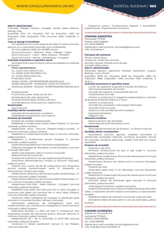 WWW.GHIDULPRIMARIILOR.RO JUDE%u021aUL SUCEAVA / 665Sate %u00een administra%u021bie:Vulture%u015fti, Ple%u015fe%u015fti, Hrea%u021bca, Giurge%u015fti, Jacota, Valea Glodului, Mere%u015fti, OsoiSuprafa%u021ba:%u00a0 5144 ha; Intravilan:%u00a0 343 ha; Extravilan:%u00a0 4801 ha; Popula%u021bia:%u00a0 3553; Gospod%u0103rii:%u00a0 1700; Locuin%u021be:%u00a0 1600; Gr%u0103dini%u021be:%u00a0 4; %u0218coli:%u00a04; Cum se ajunge in localitate:Principalele drumuri care asigur%u0103 circula%u021bia %u00een cadrul comunei, precum %u0219i cu comunele %u00eenvecinate sunt urm%u0103toarele:Drumul jude%u021bean 208C din DN28B VoronaDrumul comunal 1 %u2013 F%u0103lticeni %u2013 Petia %u2013 Ple%u0219e%u0219ti %u2013 Ude%u0219tiDrum comunal 4 %u2013 Liteni %u2013 Valea Glodului %u2013 Preute%u0219tiDrum comunal 5 %u2013 H%u00e2rtop %u2013 M%u0103n%u0103stioara %u2013 Giurge%u0219tiActivitati economice si specifice zonei:Zon%u0103 specific%u0103 %u00een pomicultur%u0103, cultivarea cerealelor %u0219i cre%u0219terea animalelorFirme reprezentative:S.C. ALMA-VIVA GROUP S.R.L.S.C. NORD AGRO BUSINES S.R.L.S.C. AGRO-PROD ZAN S.R.L.Produc%u0103tori locali:ZANCU SORIN - %u00ceNTREPRINDERE INDIVIDUAL%u0102JEDER DRAGOMIR - PERSOAN%u0102 FIZIC%u0102 AUTORIZAT%u0102NOROCEL ADRIAN - TEODOR - %u00ceNTREPRINDERE INDIVIDUAL%u0102 etc.Produse locale:Fructe (mere, pere, cire%u0219e, prune etc.)Cereale (porumb, ov%u0103z, secar%u0103 etc)Produse lactate (lapte, br%u00e2nz%u0103, urd%u0103 etc.)Animale (bovine, ovine, porcine, cabaline etc.)Evenimente:Ziua ComuneiFacilit%u00e3%u0163i oferite investitorilor:Impozite diminuate pentru investitoriPosibilitatea concesion%u0103rii unor terenuriProiecte de investi%u0163ii:Proiecte de investi%u021bii implementate:Reabilitare %u0219i modernizare %u0218coala Valea Glodului, %u00een comuna Vulture%u0219ti, jude%u021bul SuceavaModernizare drum comunal Ple%u0219e%u0219ti-Hrea%u021bca-Unce%u0219ti, %u00een comuna Vulture%u0219ti, jude%u021bul SuceavaReabilitare %u0219i modernizare %u0218coal%u0103 Osoi, %u00een comuna Vulture%u0219ti, jude%u021bul SuceavaReabilitare %u0219i modernizare %u0218coal%u0103 Giurge%u0219ti, %u00een comuna Vulture%u0219ti, jude%u021bul SuceavaImplementarea platformei informatice eDigitalizareElaborare Strategia de Dezvoltare Local%u0103 Durabil%u0103 a comunei Vulture%u0219ti 2021-2027Sistem supraveghere video %u00een comuna Vulture%u0219tiElaborare Statutul Comunei.Proiecte de investi%u021bii %u00een curs de implementare/finan%u021bare;%u00centocmirea Nomenclatorului Stradal al Comunei Vulture%u0219ti, jude%u021bul SuceavaCasarea unui num%u0103r de 50 de autoturisme prin Programul privind casarea autovehiculelor uzate, %u00een colaborare cu Administra%u021bia Fondului de mediuModernizarea sistemului de iluminat public stradal etapa I, %u00een comuna Vulture%u0219ti, jude%u021bul SuceavaModernizarea sistemului de iluminat public stradal etapa a IIa, %u00een comuna Vulture%u0219ti, jude%u021bul SuceavaModernizare DC4 Osoi - Valea Glodului - Giurge%u0219ti, comuna Vulture%u0219ti, jude%u021bulul%u00a0SuceavaReabilitare pod peste r%u00e2ul %u0218omuzul Mic %u00een satul Giurge%u0219ti %u0219i construire pod peste r%u00e2ul %u0218omuzul Mic %u00een satul Valea Glodului, comuna Vulture%u0219ti, jude%u021bul SuceavaConstruire re%u021bea inteligent%u0103 de transport %u0219i distribu%u021bie gaze naturale %u00een comunele: Bune%u0219ti, H%u00e2rtop %u0219i Vulture%u0219tiDezvoltarea sistemului de management local prin implementarea unor infrastructuri inteligente la nivelul comunei Vulture%u0219ti, jude%u021bul SuceavaReducerea emisiilor cu efect de ser%u0103 %u00een transporturi prin amplasarea sta%u021biilor de re%u00eenc%u0103rcare pentru vehicule electrice %u00een comuna Vulture%u0219ti, jude%u021bul SuceavaModernizarea DC 1 de la km12+800 la km17+693 comuna Vulture%u0219ti, jude%u021bulul SuceavaConstruire %u0219i dotare a%u0219ez%u0103m%u00e2nt cultural %u00een sat Ple%u0219e%u0219ti, comuna Vulture%u0219ti Programul pentru Transformarea Digital%u0103 a Autorit%u0103%u021bilor Publice locale- Implementare Ghiseul.roCOMUNA ZAMOSTEACod po%u0219tal: 727630Telefon: 0230-569874; Fax: 0230-569873; Adresa de e-mail: primaria_zamostea@yahoo.comURL: zamostea.roPersoane din primarie:Primar: Vasile HaliucViceprimar: Viorel Doru EnacheSecretar General: Mihaela Anca StrujacContabil: Oltea HaliucSate %u00een administra%u021bie:Zamostea, R%u0103u%u021beni, Cojoc%u0103reni,%u00a0 T%u0103ute%u0219ti, Ceom%u00e2rtan, Corpaci, Badragi, Lunca, NicaniSuprafa%u021ba:%u00a0 5079 ha; Intravilan:%u00a0 2549 ha; Extravilan:%u00a0 2530 ha; Popula%u021bia:%u00a0 2989; Gospod%u0103rii:%u00a0 1299; Locuin%u021be:%u00a0 1299; Gr%u0103dini%u021be:%u00a0 3; %u0218coli:%u00a04; Activitati economice si specifice zonei:Lucr%u0103ri de vopsitorie: Zugraveli %u0219i mont%u0103ri de GeamuriFabricarea produselor de mor%u0103ritActivit%u0103%u021bi de inginerie %u0219i Consultan%u021b%u0103%u00a0tehnic%u0103Cre%u0219terea altor animaleComer%u021b%u00a0cu am%u0103nuntul %u00een magazine nespecializate cu v%u00e2nzare de produse alimentare,b%u0103uturi %u0219i tutunComer%u021b%u00a0cu am%u0103nuntulActivit%u0103%u021bi de consulta%u021b%u0103%u00a0%u00een tehnologia informa%u021bieiActivit%u0103%u021bi %u00een ferme mixteCoafura %u0219i alte activit%u0103%u021bi de %u00eenfrumuse%u021bareExploatare forestier%u0103 Magazin mixtObiective turistice:Biserica de lemn din Zamostea Rezerva%u021bia Natural%u0103 Zamostea-LuncaEvenimente:Pia%u021ba agroalimentar%u0103 de tip iarmaroc - %u00een fiecare zi de luniFacilit%u00e3%u0163i oferite investitorilor:Dezvoltarea culturilor agricole, cre%u0219terea animalelor %u0219i valorificarea produselor ob%u021binute, constituie principala ramur%u0103 de activitate, ponderea terenurilor arabile fiind 81% din totalul suprafe%u021bei.Proiecte de investi%u0163ii:Proiecte %u00een derulare:%u00cenfiin%u021bare infrastructur%u0103 de ap%u0103 %u0219i ap%u0103 uzat%u0103 %u00een c