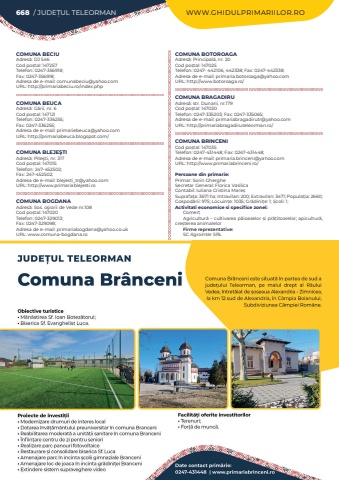 668 / JUDE%u021aUL TELEORMAN WWW.GHIDULPRIMARIILOR.ROCOMUNA BECIUAdres%u0103: DJ 546Cod po%u0219tal: 147257Telefon: 0247-356918; Fax: 0247-356918; Adresa de e-mail: comunabeciu@yahoo.comURL: http://primariabeciu.ro/index.phpCOMUNA BEUCAAdres%u0103: G%u0103rii, nr. 6Cod po%u0219tal: 147121Telefon: 0247-336255; Fax: 0247-336255; Adresa de e-mail: primariebeuca@yahoo.comURL: http://primariabeuca.blogspot.com/COMUNA BLEJE%u015eTIAdres%u0103: Pite%u015fti, nr. 317Cod po%u0219tal: 147015Telefon: 247-452502; Fax: 247-452502; Adresa de e-mail: blejesti_tr@yahoo.comURL: http://www.primariablejesti.roCOMUNA BOGDANAAdres%u0103: Sos. o%u015fiorii de Vede nr.108Cod po%u0219tal: 147020Telefon: 0247-329013;Fax: 0247-329098; Adresa de e-mail: primariabogdana@yahoo.co.ukURL: www.comuna-bogdana.roCOMUNA BOTOROAGAAdres%u0103: Principal%u0103, nr. 20Cod po%u0219tal: 147025Telefon: 0247- 442106, 442338; Fax: 0247-442338; Adresa de e-mail: primaria.botoroaga@yahoo.comURL: http://www.botoroaga.ro/COMUNA BRAGADIRUAdres%u0103: str. Dunarii, nr.179Cod po%u0219tal: 147030Telefon: 0247-335203; Fax: 0247-335065; Adresa de e-mail: primariabragadirutr@yahoo.comURL: http://primariabragadiruteleorman.ro/COMUNA BRINCENICod po%u0219tal: 147035Telefon: 0247-431448; Fax: 0247-431448; Adresa de e-mail: primaria.brinceni@yahoo.comURL: http://www.primariabrinceni.ro/Persoane din primarie:Primar: Sorin Gherghe%u00a0Secretar General: Florica VasilicaContabil: Iuliana Cristina Mare%u0219Suprafa%u021ba:%u00a03671 ha; Intravilan:%u00a0200; Extravilan:%u00a03471; Popula%u021bia:%u00a02660; Gospod%u0103rii:%u00a0975; Locuin%u021be:%u00a01035; Gr%u0103dini%u021be:%u00a01; %u0218coli:%u00a01; Activitati economice si specifice zonei:Comer%u021b Agricultur%u0103%u00a0%u2013 cultivarea p%u0103ioaselor %u0219i pr%u0103%u021bitoarelor; apicultur%u0103, cre%u0219terea animalelorFirme reprezentative:SC Agrointer SRL