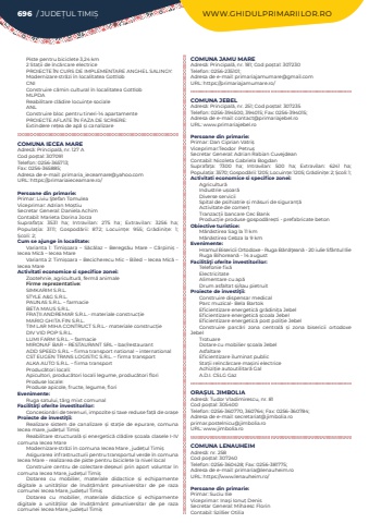 696 / JUDE%u021aUL TIMI%u0218 WWW.GHIDULPRIMARIILOR.ROPiste pentru biciclete 3,24 km2 Sta%u021bii de %u00eenc%u0103rcare electricePROIECTE %u00ceN CURS DE IMPLEMENTARE ANGHEL SALINGY:Modernizare str%u0103zi %u00een localitatea GottlobCNIConstruire c%u0103min cultural %u00een localitatea GottlobMLPDAReabilitare cl%u0103dire locuin%u021be socialeANLConstruire bloc pentru tineri-14 apartamentePROIECTE AFLATE %u00ceN FAZA DE SCRIERE:Extindere re%u021bea de ap%u0103 %u0219i canalizareCOMUNA IECEA MAREAdres%u0103: Principal%u0103, nr. 127 ACod po%u0219tal: 307091Telefon: 0256-365713; Fax: 0256-365885; Adresa de e-mail: primaria_ieceamare@yahoo.comURL: https://primariaieceamare.ro/Persoane din primarie:Primar: Liviu %u015etefan TomuleaViceprimar: Adrian Mo%u0219tiuSecretar General: Daniela AchimContabil: Marieta Dorina JorzaSuprafa%u021ba:%u00a0 3531 ha; Intravilan:%u00a0 275 ha; Extravilan:%u00a0 3256 ha; Popula%u021bia:%u00a0 3111; Gospod%u0103rii:%u00a0 872; Locuin%u021be:%u00a0 955; Gr%u0103dini%u021be:%u00a0 1; %u0218coli:%u00a02; Cum se ajunge in localitate:Varianta 1: Timi%u0219oara %u2013 S%u0103c%u0103laz %u2013 Beregs%u0103u Mare %u2013 C%u0103rpini%u0219 - Iecea Mic%u0103 %u2013 Iecea Mare Varianta 2: Timi%u0219oara %u2013 Becicherecu Mic %u2013 Biled %u2013 Iecea Mic%u0103 %u2013 Iecea MareActivitati economice si specifice zonei:Zootehnie, agricultur%u0103, ferm%u0103 animaleFirme reprezentative:SIMKARIM S.R.L.STYLE A&G S.R.L.PAUNAS S.R.L. %u2013 farmacieBETA MAUS S.R.L.FRA%u021aII ANDREMAR S.R.L.- materiale construc%u021bieMARIO GHITA FIN S.R.L.TIM LAR MIHA CONTRUCT S.R.L.- materiale construc%u021bieDIV VID POP S.R.L.LUMI FARM S.R.L. %u2013 farmacieMIRONAF BAR %u2013 RESTAURANT SRL %u2013 bar/restaurantADD SPEED S.R.L %u2013 firma transport national %u2013 internationalCST EUGEN TRANS LOGISTIC S.R.L. %u2013 firma transportALKA AUTO S.R.L. %u2013 firma transportProduc%u0103tori locali:Apicultori, produc%u0103tori locali legume, produc%u0103tori floriProduse locale: Produse apicole, fructe, legume, floriEvenimente:Ruga satului, t%u00e2rg mixt comunalFacilit%u00e3%u0163i oferite investitorilor:Concesion%u0103ri de terenuri, impozite %u0219i taxe reduse fa%u021b%u0103 de ora%u0219eProiecte de investi%u0163ii:Realizare sistem de canalizare %u0219i sta%u021bie de epurare, comuna Iecea mare, jude%u021bul Timi%u0219Reabilitare structural%u0103 %u0219i energetic%u0103 cl%u0103dire %u0219coala clasele I-IV comuna Iecea MareModernizare str%u0103zi %u00een comuna Iecea Mare , jude%u021bul Timi%u0219Asigurarea infrastructurii pentru transportul verde %u00een comuna Iecea Mare - realizarea de piste pentru biciclete la nivel localConstruire centru de colectare de%u0219euri prin aport voluntar %u00een comuna Iecea Mare, jude%u021bul Timi%u0219Dotarea cu mobilier, materiale didactice %u0219i echipamente digitale a unit%u0103%u021bilor de %u00eenv%u0103%u021b%u0103m%u00e2nt preuniversitar de pe raza comunei Iecea Mare, jude%u021bul Timi%u0219Dotarea cu mobilier, materiale didactice %u0219i echipamente digitale a unit%u0103%u021bilor de %u00eenv%u0103%u021b%u0103m%u00e2nt preuniversitar de pe raza comunei Iecea Mare, jude%u021bul Timi%u0219COMUNA JAMU MAREAdres%u0103: Principal%u0103, nr. 181; Cod po%u0219tal: 307230Telefon: 0256-235101; Adresa de e-mail: primariajamumare@gmail.comURL: https://primariajamumare.ro/COMUNA JEBELAdres%u0103: Principal%u0103, nr. 251; Cod po%u0219tal: 307235Telefon: 0256-394500, 394015; Fax: 0256-394015; Adresa de e-mail: contact@primariajebel.roURL: www.primariajebel.roPersoane din primarie:Primar: Dan Ciprian Vatri%u0219%u00a0Viceprimar:Teodor%u00a0 Petru%u0219%u00a0Secretar General: Adrian Rabian Cuvejdean%u00a0Contabil: Nicoleta Gabriela Bogdan%u00a0Suprafa%u021ba:%u00a0 7300 ha; Intravilan:%u00a0 500 ha; Extravilan:%u00a0 6241 ha; Popula%u021bia:%u00a03570; Gospod%u0103rii:%u00a01205; Locuin%u021be:%u00a01205; Gr%u0103dini%u021be:%u00a02; %u0218coli:%u00a01; Activitati economice si specifice zonei:Agricultur%u0103Industrie u%u0219oar%u0103Diverse serviciiSpital de psihiatrie %u0219i m%u0103suri de siguran%u021b%u0103Activitate de comer%u021bTranzac%u021bii bancare Cec%u00a0BankProduc%u021bie produse gospod%u0103re%u0219ti - prefabricate betonObiective turistice:M%u0103n%u0103stirea Sag la 11 kmM%u0103n%u0103stirea Cebza la 9 kmEvenimente:Hramul Bisericii Ortodoxe - Ruga B%u0103n%u0103%u0163ean%u0103 -%u00a020 iulie Sf%u00e2ntul IlieRuga Bihorean%u0103 - 14 august%u00a0Facilit%u00e3%u0163i oferite investitorilor:Telefonie fix%u0103ElectricitateAlimentare cu ap%u0103Drum asfaltat %u0219i/sau pietruitProiecte de investi%u0163ii:Construire dispensar medicalParc muzical- Bela BartokEficientizare energetic%u0103 gr%u0103dini%u021ba JebelEficientizare energetic%u0103 %u0219coala JebelEficientizare energetic%u0103 post poli%u021bie JebelConstruire parc%u0103ri zona central%u0103 %u0219i zona bisericii ortodoxe JebelTrotuareDotare cu mobilier %u0219coala JebelAsfaltareEficientizare iluminat publicSta%u021bii re%u00eenc%u0103rcare ma%u0219ini electriceAchizi%u021bie autoutilitar%u0103 Gal A.D.I. CSLG GazORA%u0218UL JIMBOLIAAdres%u0103: Tudor Vladimirescu, nr. 81Cod po%u0219tal: 305400Telefon: 0256-360770, 360764; Fax: 0256-360784; Adresa de e-mail: secretariat@jimbolia.roprimar.postelnicu@jimbolia.roURL: www.jimbolia.roCOMUNA LENAUHEIMAdres%u0103: nr. 258Cod po%u0219tal: 307240Telefon: 0256-360428; Fax: 0256-381775; Adresa de e-mail: primaria@lenauheim.roURL: https://www.lenauheim.ro/Persoane din primarie:Primar: Suciu IlieViceprimar: Ina%u015fi Ionu%u021b DenisSecretar General: Mihaesc FlorinContabil: Szillier Otilia