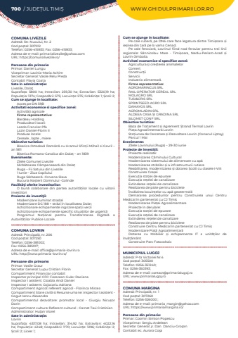 700 / JUDE%u021aUL TIMI%u0218 WWW.GHIDULPRIMARIILOR.ROCOMUNA LIVEZILEAdres%u0103: Str. Nucului, Nr. 2Cod po%u0219tal: 307012Telefon: 0256-415933; Fax: 0256-415933; Adresa de e-mail: primarialivezile@yahoo.comURL: https://comunalivezile.ro/Persoane din primarie:Primar: Daniel LunguViceprimar: Lavinia-Maria AchimSecretar General: Vasile Relu PredaContabil: Flavia CoataSate %u00een administra%u021bie:Livezile, Dola%u0163Suprafa%u021ba:%u00a0 5800 ha; Intravilan:%u00a0 259,30 ha; Extravilan:%u00a0 5320,19 ha; Popula%u021bia:%u00a01374; Gospod%u0103rii:%u00a0575; Locuin%u021be:%u00a0575; Gr%u0103dini%u021be:%u00a01; %u0218coli:%u00a02; Cum se ajunge in localitate:Acces pe DN 59BActivitati economice si specifice zonei:Activit%u0103%u021bi agricoleFirme reprezentative:Bardeau HoldingProduc%u0103tori locali:Laszlo Francisc PfaLazin Daniel-Florin IIProduse locale:Cereale , lapte , miereObiective turistice:Biserica Ortodox%u0103 Rom%u00e2n%u0103 cu Hramul Sfin%u021bii Mihail si Gavril %u2013 an 1811 Biserica Romano-Catolica din Dola%u021b %u2013 an 1839Evenimente:Zilele Comunei LivezileS%u0103rb%u0103toarea C%u00e2mpeneasc%u0103 din Dola%u021bRuga %u2013 Fii Satului din Livezile1 Iunie %u2013 Ziua CopiluluiRuga S%u00e2rbeasc%u0103 -Crcvena Slava Bucuria Na%u0219terii Domnului -ColindeFacilit%u00e3%u0163i oferite investitorilor:O bun%u0103 colaborare din partea autorit%u0103%u021bilor locale cu viitorii investitoriProiecte de investi%u0163ii:Modernizare iluminat stradalModernizare DC 188 + str%u0103zi %u00een localitatea Dola%u021bAchizitionare echipamente ingrizire spa%u021bii verziAchizi%u021bionare echipamente specific situa%u021biilor de urgen%u021b%u0103Programul Na%u021bional pentru Transformarea Digital%u0103 a Autorit%u0103%u021bilor Publice LocaleCOMUNA LOVRINAdres%u0103: Principal%u0103, nr. 206Cod po%u0219tal: 307250Telefon: 0256-381002; Fax: 0256-381207; Adresa de e-mail: office@primaria-lovrin.roURL: http://www.primaria-lovrin.ro/Persoane din primarie:Primar: Vasile GraurSecretar General: Lupu Cristian FlorinCompartiment Financiar contabil:Inspector principal CFC: Ferecean Guler DacianaInspector I asistent: Cioabla Andi DanielInspector I asistent: Cojocariu AdrianaCompartiment Agricol: referent agricol - Florinca MirceaCompartiment Stare civil%u0103 si Resurse umane: inspector I asistent - Gogut Iancu AlexandraCompartimentul dezvoltare: promotor local - Giurgiu Nicu%u0219or DorinCompartiment cultura: Referent cultural - Carnat Tavi CristinianAdministrator: Hu%u021ban ViorelSate %u00een administra%u021bie:LovrinSuprafa%u021ba:%u00a0 4337,08 ha; Intravilan:%u00a0 314,92 ha; Extravilan:%u00a0 4022,16 ha; Popula%u021bia:%u00a04248; Gospod%u0103rii:%u00a01170; Locuin%u021be:%u00a01296; Gr%u0103dini%u021be:%u00a02; %u0218coli:%u00a02; Licee:%u00a01; Cum se ajunge in localitate:Pe cale rutier%u0103, pe DN6 care face legatura dintre Timi%u0219oara %u0219i ie%u0219irea din %u021bar%u0103 pe la vama Cenad. Pe cale feroviar%u0103, Lovrinul fiind nod feroviar pentru trei linii regionale: S%u00e2nnicolau Mare - Timi%u0219oara, Ner%u0103u-Periam-Arad %u0219i Lovrin-Jimbolia.Activitati economice si specifice zonei:Agricultura %u0219i cre%u0219terea animalelorComer%u021bConstruc%u021biiServiciiIndustria alimentar%u0103.Firme reprezentative:AGROMARINCUS SRLRAIL OPERATOR CEREAL SRLMOLAGRO SRLTUSI&CRIS SRLSPRINTSEED AGRO SRLDAMAYOS SRLAGROMLADIN SRLALDEEA CASA %u0218I GRADINA SRL SILOMET CONF SRLObiective turistice:Baza de Tratament %u0219i Agrement %u0218trand Termal LovrinPia%u021ba Agroalimentar%u0103 LovrinSta%u021biunea de Cercetare %u0219i Dezvoltare Lovrin (Conacul Liptay) Parcul 1 MaiEvenimente:Zilele Lovrinului (Ruga) %u2013 29-30 iunieProiecte de investi%u0163ii:Proiecte realizate:Modernizarea C%u0103minului CulturalModernizarea sistemului de alimentare cu ap%u0103Modernizarea str%u0103zilor %u0219i a infrastructurii rutiereReabilitarea, modernizarea %u0219i dotarea %u0218colii cu clasele I-VIIIConstruirea Cre%u0219eiExecu%u021bia sta%u021biei de epurareExecu%u021bia re%u021belei de canalizareExtinderea re%u021belei de canalizareRealizarea de piste pentru biciclete%u00cenc%u0103lzirea locuin%u021belor cu ap%u0103%u00a0geotermal%u0103Demararea procedurilor pentru Construirea unui Centru Medical %u00een parteneriat cu CJ Timi%u0219Modernizarea Pie%u021bei AgroalimentareProiecte %u00een derulare:Execu%u021bia sta%u021biei de epurareExecu%u021bia re%u021belei de canalizareExtinderea re%u021belei de canalizareRealizarea de piste pentru bicicleteConstruire Centru Medical %u00een parteneriat cu CJ Timi%u0219Modernizare Pia%u021b%u0103 Agroalimentar%u0103Dotarea cu Mobilier %u0219i echipamente IT a unit%u0103%u021bilor de %u00eenv%u0103%u021b%u0103m%u00e2nt Construire Parc FotovoltaicMUNICIPIUL LUGOJAdres%u0103: P-ta Victoriei Nr.4Cod po%u0219tal: 305500Telefon: 0256-351240; Fax: 0256-350393; Adresa de e-mail: contact@primarialugoj.roURL: www.primarialugoj.roCOMUNA MARGINAAdres%u0103: Principal%u0103, nr. 1Cod po%u0219tal: 307260Telefon: 0256-326000 ; Adresa de e-mail: primaria_margin@yahoo.comURL: https://www.primariamargina.ro/Persoane din primarie:Primar:%u00a0Cosmin Simion PopescuViceprimar: Sergiu ArdeleanSecretar General: jr.%u00a0Dan%u00a0%u00a0Danciu-Gro%u015fan%u00a0Contabil: ec.%u00a0Aurora%u00a0Co%u015fa%u00a0