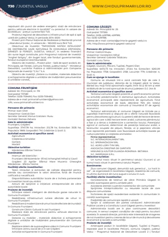 nepoluant din punct de vedere energetic: sta%u021bii de re%u00eenc%u0103rcare pentru vehicule electrice %u00een localit%u0103%u021bi%u201d cu proiectul: %u00een valoare de 63.000Euro - pre%u021buri curente f%u0103r%u0103 TVAProiectul regional de dezvoltare a infrastructurii de ap%u0103 %u0219i ap%u0103 uzat%u0103 din jude%u021bul Vaslui, %u00een perioada 2014-2020Proiect prin Planul Na%u021bional de Redresare %u0219i Rezilien%u021b%u0103 privind ,, Abandonul %u0218colar,, %u00een valoare de %u2013 180.000 euro f%u0103r%u0103%u00a0TVAObiectivul de %u00eenvesti%u021bii: %u201d%u00ceNFIIN%u021aARE SISTEM INTELIGENT DE DISTRIBU%u021aIE GAZE NATURALE %u00ceN COMUNELE Z%u0102PODENI, D%u0102NE%u0218TI %u0218I FERE%u0218TI, JUDE%u021aUL VASLUI%u201d, %u00een vederea finan%u021b%u0103rii din surse legal constituite, prin Programul na%u021bional de investi%u021bii %u201cAnghel Saligny%u201d, din buget local, alte fonduri guvernamentale, fonduri europene nerambursabileObiectiv de investi%u0163ii ,, Proiect pilot %u2013 Sal%u0103%u00a0de sport %u0219colar%u0103, str.Principala, sat Fere%u0219ti, comuna Fere%u0219%u021bi, jude%u021bul Vaslui%u201d - Ministerul Dezvolt%u0103rii, Lucr%u0103rilor Publice %u0219i Administra%u021biei prin Compania Na%u0163ional%u0103 de Investi%u0163ii %u201cC.N.I.%u201d S.A.Obiectiv de investi%u0163ii ,,Dotare cu mobilier, materiale didactice %u0219i echipamente digitale a unit%u0103%u021bilor de %u00eenv%u0103%u021b%u0103m%u00e2nt preuniversitar %u0219i unit%u0103%u021bilor conexe,,COMUNA FRUNTI%u015eENIAdres%u0103: Str. Principal%u0103, nr. 119Cod po%u0219tal: 737281Telefon: 0235-709490; Fax: 0235-709490; Adresa de e-mail: primariafruntiseni@yahoo.comURL: www.primariafruntiseni.roPersoane din primarie:Primar:%u00a0Ioan%u00a0OnelViceprimar: Costic%u0103 DanSecretar General:%u00a0Marius Gratziani%u00a0%u00a0Rusu%u00a0Contabil: Romeo%u00a0Zaharia%u00a0Sate %u00een administra%u021bie:Frunti%u015feni, Gr%u0103jdeniSuprafa%u021ba:%u00a0 3747,78 ha; Intravilan:%u00a0 212,78 ha; Extravilan:%u00a0 3535 ha; Popula%u021bia:%u00a01869; Gospod%u0103rii:%u00a0741; Gr%u0103dini%u021be:%u00a02; %u0218coli:%u00a02; Activitati economice si specifice zonei:Agricultur%u0103Cre%u015fterea animalelorComer%u0163Mor%u0103rit%u00a0Obiective turistice:M%u0103n%u0103stirea Sf%u00e2ntei TreimeEvenimente:Hramuri ale bisericilor :Frun%u021bi%u0219eni 08 Noiembrie- Sfin%u021bii Arhangheli Mihail %u0219i GavrilGrajdeni 23 Aprilie- Sf%u00e2ntul Mare Mucenic Gheorghe M%u0103n%u0103stirea - Sf%u00e2nta TreimeFacilit%u00e3%u0163i oferite investitorilor:Teren intravilan %u0219i extravilan de calitate disponibil pentru arenda sau concesionare la valori atractive, for%u021b%u0103%u00a0 de munc%u0103 calificat%u0103%u00a0%u0219i necalificat%u0103Disponibilitatea autorit%u0103%u021bilor locale de a %u00eencheia parteneriate cu investitori locali sau str%u0103iniAc%u021biuni de sprijinire a ini%u021biativei antreprenoriale de c%u0103tre autorit%u0103%u021bile localeProiecte de investi%u0163ii:%u00cenfiin%u021bare sistem inteligent de distribu%u021bie gazae naturale %u00een Comuna Frun%u021bi%u0219eniReabilitarea infrastructurii rutiere afectate de viituri %u00een Comuna Frun%u021bi%u0219eniReabilitare %u0219i modernizare drumuri locale afectate de inunda%u021bii %u00een Comuna Frun%u021bi%u0219eniConstruire C%u0103min Cultural %u00een sat Frun%u021bi%u0219eni Realizare sta%u021bii de re%u00eenc%u0103rcare pentru vehicule electrice %u00een Comuna Frun%u021bi%u0219eniDotarea cu mobilier , materiale didactice %u0219i echipamente digitale a unit%u0103%u021bilor de %u00eenv%u0103%u021b%u0103m%u00e2nt preuniversitar din Comuna Frun%u021bi%u0219eniRealizare sistem de supraveghere video %u00een Comuna Frun%u021bi%u0219eni%u00cenfiin%u021bare centru social de zi %u00een sat Gr%u0103jdeniAchizi%u021bie echipamente %u00een Comuna Frun%u021bi%u0219eniCOMUNA G%u0102GE%u015eTIAdres%u0103: Str. Principal%u0103 Nr. 25Cod po%u0219tal: 737255Telefon: 0235-429788, 429789; Fax: 0235-429788; Adresa de e-mail: contact@primaria-gagesti-vaslui.roURL: http://www.primaria-gagesti-vaslui.ro/Persoane din primarie:Primar: Costic%u0103 StupuViceprimar: Constantin MihalSecretar General: Gabriela T%u0103b%u0103caruContabil: Liviu TomaSate %u00een administra%u021bie:G%u0103ge%u015fti, Giurcani, Peicani, Tupila%u0163i, Popeni-ElanSuprafa%u021ba:%u00a0 6472,73 ha; Intravilan:%u00a0 211,64 ha; Extravilan:%u00a0 6261,09 ha; Popula%u021bia:%u00a0 1758; Gospod%u0103rii:%u00a0 2158; Locuin%u021be:%u00a0 779; Gr%u0103dini%u021be:%u00a0 4; %u0218coli:%u00a04; Cum se ajunge in localitate:Comuna se situeaz%u0103 %u00eentr-o zon%u0103 central%u0103 fa%u0163%u0103 de cele 3 municipii ale jude%u0163ului, distan%u0163a de la G%u0103ge%u015fti p%u00e2n%u0103 la Vaslui, B%u00e2rlad sau Hu%u015fi fiind aproximativ egal%u0103, %u00eentre 45 %u015fi 50 km %u015fi este str%u0103b%u0103tut%u0103 de la nord spre sud de drumul jude%u021bean D.J. 244 B.Activitati economice si specifice zonei:Teritoriul comunei G%u0103ge%u0219ti prezint%u0103 un profil economic primar cu activit%u0103%u0163i predominante %u00een domeniul agriculturii. Activitatea economic%u0103 principal%u0103 este reprezentat%u0103 de agricultur%u0103, fiind activitatea economic%u0103 de baz%u0103, de%u0163in%u00e2nd 76% din totalul activit%u0103%u0163ilor economice din comun%u0103 %u015fi %u00eensum%u00e2nd 37 de agen%u0163i economici.Teritoriul administrativ al comunei G%u0103ge%u0219ti se %u00eentinde pe o suprafa%u0163%u0103 %u00eensemnat%u0103 %u015fi dispune de o ofert%u0103 natural%u0103 favorabil%u0103 pentru dezvoltarea agriculturii. Cu peste 5.468 de hectare de teren agricol din care 4.065 hectare teren arabil, cultivarea p%u0103m%u00e2ntului a fost %u0219i a r%u0103mas o %u00eendeletnicire a oamenilor locului. Poten%u0163ialul agricol al comunei, determinat de prezen%u0163a terenului arabil, a terenurilor ocupate de p%u0103%u015funi, f%u00e2ne%u0163e, vii %u015fi pepiniere viticole care re