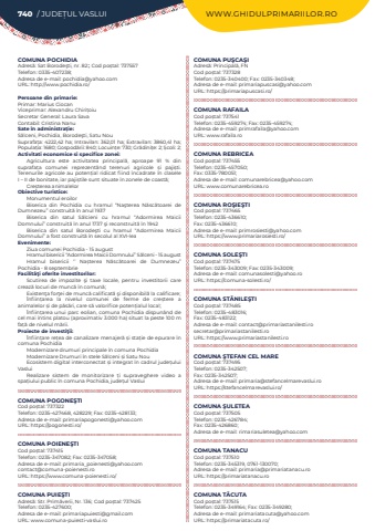 COMUNA POCHIDIAAdres%u0103: Sat Borode%u015fti, nr. 82; Cod po%u0219tal: 737557Telefon: 0335-407238; Adresa de e-mail: pochidia@yahoo.comURL: http://www.pochidia.ro/Persoane din primarie:Primar: Marius CiocanViceprimar: Alexandru Chiri%u021boiuSecretar General: Laura SavaContabil: Cristina NanuSate %u00een administra%u021bie:S%u0103lceni, Pochidia, Borode%u015fti, Satu NouSuprafa%u021ba:%u00a04222,42 ha; Intravilan:%u00a0362,01 ha; Extravilan:%u00a03860,41 ha; Popula%u021bia:%u00a01680; Gospod%u0103rii:%u00a0840; Locuin%u021be:%u00a0730; Gr%u0103dini%u021be:%u00a02; %u0218coli:%u00a02; Activitati economice si specifice zonei:Agricultura este activitatea principal%u0103, aproape 91 % din suprafa%u021ba comunei reprezent%u00e2nd terenuri agricole %u0219i paji%u0219ti. Terenurile agricole au poten%u021bial ridicat fiind %u00eencadrate %u00een clasele I %u2013 II de bonitate, iar paji%u0219tile sunt situate %u00een zonele de coast%u0103;%u00a0Cre%u0219terea animalelorObiective turistice:Monumentul eroilorBiserica din Pochidia cu hramul %u201cNa%u015fterea N%u0103sc%u0103toarei de Dumnezeu%u201d construit%u0103 %u00een anul 1937Biserica din satul S%u0103lcieni cu hramul %u201cAdormirea Maicii Domnului%u201d construit%u0103 %u00een anul 1737 %u015fi reconstruit%u0103 %u00een 1942Biserica din satul Borode%u015fti cu hramul %u201cAdormirea Maicii Domnului%u201d a fost construit%u0103 %u00een secolul al XVI-leaEvenimente:Ziua comunei Pochidia - 15 augustHramul bisericii %u201cAdormirea Maicii Domnului%u201d S%u0103lceni - 15 augustHramul bisericii %u2018%u2019 Na%u0219terea N%u0103sc%u0103toarei de Dumnezeu%u201d Pochidia - 8 septembrieFacilit%u00e3%u0163i oferite investitorilor:Scutirea de impozite %u015fi taxe locale, pentru investitorii care creaz%u0103 locuri de munc%u0103 %u00een comun%u0103;%u00a0Existen%u0163a for%u0163ei de munc%u0103 calificat%u0103 %u015fi disponibil%u0103 la calificare;%u00cenfiin%u021barea la nivelul comunei de ferme de cre%u0219tere a animalelor %u0219i de p%u0103s%u0103ri, care s%u0103 valorifice poten%u021bialul local;%u00a0%u00cenfiin%u021barea unui parc eolian, comuna Pochidia dispun%u00e2nd de cel mai %u00eentins platou (aproximativ 3.000 ha) situat la peste 100 m fa%u021b%u0103 de nivelul m%u0103rii.Proiecte de investi%u0163ii:%u00cenfiin%u021bare re%u021bea de canalizare menajer%u0103%u00a0%u0219i sta%u021bie de epurare %u00een comuna PochidiaModernizare drumuri principale %u00een comuna PochidiaModernizare Drumuri %u00een stele S%u0103lceni %u0219i Satu NouEcosistem digital interconectat %u0219i integrat %u00een cadrul jude%u021bului VasluiRealizare sistem de monitorizare %u021bi supraveghere video a spa%u021biului public %u00een comuna Pochidia, jude%u021bul VasluiCOMUNA POGONE%u015eTICod po%u0219tal: 737322Telefon: 0235-427468, 428229; Fax: 0235-428133; Adresa de e-mail: primariapogonesti@yahoo.comURL: https://pogonesti.ro/COMUNA POIENE%u015eTICod po%u0219tal: 737415Telefon: 0235-347082; Fax: 0235-347058; Adresa de e-mail: primaria_poienesti@yahoo.comcontact@comuna-poienesti.roURL: https://www.comuna-poienesti.ro/COMUNA PUIE%u015eTIAdres%u0103: Str. Prim%u0103verii, Nr. 136; Cod po%u0219tal: 737425Telefon: 0235-427600; Adresa de e-mail: primariapuiesti@gmail.comURL: www.comuna-puiesti-vaslui.roCOMUNA PU%u015eCA%u015eIAdres%u0103: Principal%u0103, FNCod po%u0219tal: 737328Telefon: 0235-340400; Fax: 0235-340348; Adresa de e-mail: primariapuscasi@yahoo.comURL: https://primariapuscasi.ro/COMUNA RAFAILACod po%u0219tal: 737541Telefon: 0235-459274; Fax: 0235-459274; Adresa de e-mail: primrafaila@yahoo.comURL: www.rafaila.roCOMUNA REBRICEACod po%u0219tal: 737455Telefon: 0235-457050; Fax: 0335-780051; Adresa de e-mail: comunarebricea@yahoo.comURL: www.comunarebricea.roCOMUNA RO%u015eIE%u015eTICod po%u0219tal: 737465Telefon: 0235-436610; Fax: 0235-436610; Adresa de e-mail: primrosiesti@yahoo.comURL: https://www.primariarosiesti.ro/COMUNA SOLE%u015eTICod po%u0219tal: 737475Telefon: 0235-343009; Fax: 0235-343009; Adresa de e-mail: comunasolesti@yahoo.roURL: https://comuna-solesti.ro/COMUNA ST%u0102NILE%u015eTICod po%u0219tal: 737485Telefon: 0235-483016; Fax: 0235-483122; Adresa de e-mail: contact@primariastanilesti.ro secretar@primariastanilesti.roURL: https://www.primariastanilesti.roCOMUNA %u015eTEFAN CEL MARECod po%u0219tal: 737495Telefon: 0235-342507; Fax: 0235-342507; Adresa de e-mail: primaria@stefancelmarevaslui.roURL: https://stefancelmarevaslui.ro/COMUNA %u015eULETEACod po%u0219tal: 737505Telefon: 0235-426784; Fax: 0235-426860; Adresa de e-mail: rimariasuletea@yahoo.comCOMUNA TANACUCod po%u0219tal: 737510Telefon: 0235-345319, 0761-130070; Adresa de e-mail: primaria@primariatanacu.ro URL: https://primariatanacu.roCOMUNA T%u0102CUTACod po%u0219tal: 737515Telefon: 0235-349164; Fax: 0235-349280; Adresa de e-mail: primariatacuta@yahoo.comURL: https://primariatacuta.ro/740 / JUDE%u021aUL VASLUI WWW.GHIDULPRIMARIILOR.RO