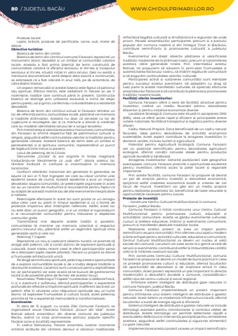80 / JUDE%u021aUL BAC%u0102U WWW.GHIDULPRIMARIILOR.ROProduse locale:Lapte, br%u00e2nz%u0103, produse de panifica%u021bie, carne, ou%u0103, miere de albineObiective turistice:Biserica de lemn din cimitirBiserica de lemn din cimitirul comunei Faraoani reprezint%u0103 un monument istoric deosebit %u0219i un simbol al comunit%u0103%u021bii catolice locale. Aceasta a fost prima biseric%u0103 de lemn construit%u0103 de comunitatea catolic%u0103 la sf%u00e2r%u0219itul secolului al XIV-lea %u0219i %u00eenceputul secolului al XV-lea, situat%u0103 ini%u021bial %u00een vatra satului. De%u0219i nu exist%u0103 o men%u021biune documentar%u0103 cert%u0103 despre data exact%u0103 a construc%u021biei, se estimeaz%u0103 c%u0103 a fost ridicat%u0103 %u00een anul 1435, pe 26 octombrie, de c%u0103tre Balint Marton.Un aspect remarcabil al acestei biserici este faptul c%u0103 patronul s%u0103u spiritual, Sf%u00e2ntul Martin, este s%u0103rb%u0103torit %u00een fiecare an pe 11 noiembrie, tradi%u021bie care continu%u0103 p%u00e2n%u0103 %u00een prezent. Construc%u021bia bisericii se distinge prin utilizarea exclusiv%u0103 a inimii de stejar pentru pere%u021bi, u%u0219i %u0219i grinzi, conferindu-i o durabilitate %u0219i o rezisten%u021b%u0103 deosebit%u0103.Biserica de lemn din cimitirul actual al Faraoani r%u0103m%u00e2ne un loc de referin%u021b%u0103 pentru comunitatea local%u0103, p%u0103str%u00e2nd vie memoria %u0219i tradi%u021biile str%u0103mo%u0219ilor. Aceasta nu doar c%u0103 serve%u0219te ca loc de rug%u0103ciune %u0219i reculegere, dar %u0219i ca m%u0103rturie a istoriei %u0219i credin%u021bei care au modelat identitatea satului de-a lungul secolelor.Prin men%u021binerea %u0219i valorizarea acestui monument, comunitatea din Faraoani %u00ee%u0219i afirm%u0103 respectul fa%u021b%u0103 de patrimoniul cultural %u0219i religios, asigur%u00e2nd astfel continuitatea valorilor %u0219i tradi%u021biilor pentru genera%u021biile viitoare. Aceast%u0103 biseric%u0103 de lemn este un simbol al perseveren%u021bei %u0219i al spiritului comunitar, reprezent%u00e2nd un punct de leg%u0103tur%u0103 %u00eentre trecut %u0219i prezent.Locul de pelerinaj de la CiciolaDenumirea %u201eCiciola%u201d %u00ee%u0219i are originile %u00een limba maghiar%u0103, traduc%u00e2ndu-se literalmente ca %u201esub v%u00e2rf%u201d. Istoria acestui loc r%u0103m%u00e2ne %u00eenv%u0103luit%u0103 %u00een confuzie %u0219i incertitudine %u00een memoria localnicilor.Conform relat%u0103rilor transmise din genera%u021bie %u00een genera%u021bie, se spune c%u0103 aici ar fi fost %u00eengropa%u021bi cei care au c%u0103zut victime unei epidemii severe de cium%u0103. Aceast%u0103 epidemie a avut un impact devastator asupra comunit%u0103%u021bii, iar pelerinajele organizate %u00een acest loc au un caracter de mul%u021bumire %u0219i recuno%u0219tin%u021b%u0103 pentru faptul c%u0103 au sc%u0103pat de aceast%u0103 molim%u0103 sau de alte evenimente inexplicabile %u0219i nefaste.Pelerinajele efectuate %u00een acest loc sunt privite ca un omagiu adus celor care au pierit %u00een timpul epidemiei %u0219i ca o form%u0103 de protec%u021bie %u00eempotriva altor %u00eent%u00e2mpl%u0103ri nefericite. Astfel, acest loc nu este doar un punct geografic, ci %u0219i un simbol al supravie%u021buirii %u0219i al recuno%u0219tin%u021bei comunit%u0103%u021bii pentru %u00eendurarea %u0219i dep%u0103%u0219irea vremurilor grele.Transmi%u021b%u00e2nd mai departe aceste tradi%u021bii %u0219i povestiri, comunitatea %u00ee%u0219i men%u021bine vie memoria colectiv%u0103 %u0219i respectul pentru trecutul s%u0103u, p%u0103str%u00e2nd astfel un leg%u0103m%u00e2nt spiritual %u00eentre genera%u021biile vechi %u0219i cele noi.Pelerinaj 7 Capele%u00a0Reprezint%u0103 un nou %u0219i captivant obiectiv turistic ce promite s%u0103 atrag%u0103 at%u00e2t pelerini, c%u00e2t %u0219i turi%u0219ti dornici de explorare spiritual%u0103 %u0219i cultural%u0103. Acest traseu recent creat le ofer%u0103 participan%u021bilor %u0219ansa de a descoperi %u0219apte capele pitore%u0219ti, fiecare cu propria sa istorie %u0219i frumuse%u021be arhitectural%u0103 unic%u0103.Pe l%u00e2ng%u0103 semnifica%u021bia spiritual%u0103, pelerinajul este o oportunitate de a explora comunit%u0103%u021bile locale %u0219i de a %u00eenv%u0103%u021ba despre tradi%u021biile %u0219i obiceiurile acestora. Localnicii sunt cunoscu%u021bi pentru ospitalitatea lor, iar participan%u021bii vor avea ocazia s%u0103 se bucure de gastronomia local%u0103 %u0219i de pove%u0219tile pline de farmec ale acestor locuri.Noul traseu %u201cPelerinajul 7 Capele%u201d nu este doar o c%u0103l%u0103torie fizic%u0103, ci %u0219i o aventur%u0103 a sufletului, oferind participan%u021bilor o experien%u021b%u0103 profund%u0103 de reflec%u021bie %u0219i %u00eemplinire spiritual%u0103. Indiferent dac%u0103 e%u0219ti un pelerin aflat %u00een c%u0103utarea unor r%u0103spunsuri spirituale sau un turist dornic s%u0103 exploreze frumuse%u021bea %u0219i cultura local%u0103, acest pelerinaj promite s%u0103 fie o experien%u021b%u0103 memorabil%u0103 %u0219i transformatoare.%u00b7 %u00a0 %u00a0 %u00a0 %u00a0Evenimente:%u00cen data de 15 august, cu ocazia Zilei Comunei Faraoani, se organizeaz%u0103 anual Festivalul Folcloric %u201eEcouri din Vale%u201d. Acest festival adun%u0103 ansambluri din diverse comune ale jude%u021bului Bac%u0103u, av%u00e2nd ca scop promovarea portului popular specific fiec%u0103rei zone %u0219i localit%u0103%u021bi reprezentate.%u00cen cadrul festivalului, fiecare ansamblu sus%u021bine momente artistice alc%u0103tuite din c%u00e2ntece, dansuri %u0219i obiceiuri tradi%u021bionale, reflect%u00e2nd bog%u0103%u021bia cultural%u0103 %u0219i etnofolcloric%u0103 a regiunilor de unde provin. Parada ansamblurilor participante, precum %u0219i a portului popular din comuna noastr%u0103 %u0219i din %u00eentregul %u021ainut al Bac%u0103ului, contribuie semnificativ la promovarea cultural%u0103 a jude%u021bului Bac%u0103u.Evenimentul are drept obiectiv p%u0103strarea %u