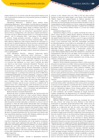 WWW.GHIDULPRIMARIILOR.RO JUDE%u021aUL BAC%u0102U / 89poate m%u00e2ndri si cu un num%u0103r mare de monumente istorice %u015fi de cult. O parte dintre acestea sunt monumente istorice, iar altele au valoare istoric%u0103.Cele mai importante l%u0103ca%u0219e de cult sunt:M%u0103n%u0103stirea R%u0103ducanu %u2013 Biserica Buna Vestire Fosta m%u0103n%u0103stirea R%u0103ducanu %u2013 Buna Vestire, numit%u0103 ulterior %u015fi %u201eBiserica Buna Vestire%u201d sau %u201eR%u0103ducanu%u201d, a fost construit%u0103 de marele logof%u0103t Ion Buhu%u015f %u015fi un t%u00e2rgove%u0163 bogat, Pav%u0103l, la sf%u00e2r%u015fitul secolului al XVII-lea %u015fi %u00eenceputul secolului al XVIII-lea, %u00een ora%u015ful Tg. Ocna. Biserica R%u0103ducanu este un monument reprezentativ pentru barocul t%u00e2rziu moldovenesc. Din cele doua clopote ale bisericii, cel mare, turnat %u00een Sf%u00e2ntul Munte Athos, cu o inscrip%u0163ie %u00een limba greac%u0103 %u2013 din 10 noiembrie 1810 %u2013 este expus in fata bisericii. %u00cen exterior, l%u00e2ng%u0103 peretele sud-estic al bisericii, se gase%u015fte morm%u00e2ntul marelui om politic %u015fi scriitor, Costache Negri %u2013 1812-1876. Biserica R%u0103ducanu este singura biseric%u0103 din Romania cu text francez %u00een pisanie. Biserica a trecut %u015fi printr-o perioad%u0103 mai dificil%u0103 aceasta fiind devastat%u0103 de c%u0103tre atacurile turcilor %u00een 1821, %u00eens%u0103 a fost repictat%u0103 %u015fi ref%u0103cut%u0103 %u00een 1830 odat%u0103 cu catapeteasma. Sunt p%u0103strate p%u0103r%u0163i din vechea incint%u0103 a bisericii, un zid de 5.20 metri prev%u0103zut cu por%u0163i de stejar, c%u00e2teva construc%u0163ii anexe %u015fi un turn cu gang boltit.Fosta M%u0103n%u0103stire Precista - Biserica %u201cAdormirea Maicii Domnului %u201c Biserica %u201cAdormirea Maicii Domnului %u201c, fost%u0103 M%u0103n%u0103stire %u201cPrecista%u201d a fost construit%u0103 de marele vistier Gheorghe Ursache , pe la 1662, %u015fi a fost inchinat%u0103 M%u0103n%u0103stirii Ivir de la Muntele Athos %u00een 1683. A fost %u00eenzestrat%u0103 cu peste 74 de mo%u015fii in 9 %u0163inuturi ale Moldovei, cu mori, case si pr%u0103v%u0103lii de c%u0103tre unii domni %u015fi mari boieri. Veniturile M%u0103n%u0103stirii %u201cPrecista%u201d sunt consemnate %u00een unele statistici din sec.al XIX-lea. M%u0103n%u0103stirea a trecut prin momente dificile datorit%u0103 r%u0103zboaielor %u015fi jafurilor f%u0103cute de trupe invadatoare: t%u0103tari, poloni, austrieci, turci. P%u00e2n%u0103 la secularizare, m%u0103n%u0103stirea a fost condus%u0103 de 16 egumeni greci. Costache Negruzzi , cu prilejul unei vizite la Tg. Ocna in 1850, face o interesant%u0103 descriere a turnului %u201cPrecistei%u201d: %u201cTurnul e o zidire curioas%u0103. El este p%u0103trat, de o circunferin%u0163%u0103 de 12 st%u00e2njeni %u015fi de o %u00een%u0103l%u0163ime de 5-6. Se cunoa%u015fte c%u0103 a fost zidit cu mult %u00eenainte de m%u0103n%u0103stire %u015fi c%u0103 menirea lui n-a fost de a servi de clopotni%u0163%u0103. Gios are o %u00eenc%u0103pere mare , care a fost, cum se vede , magazie sau %u00eenchisoare. Dinspre nord te sui pe o sc%u0103ri%u0163%u0103 la o %u00eenal%u0163ime de 15 palme %u015fi %u00eentre, %u00eentr-o s%u0103li%u0163%u0103 %u00eengust%u0103, unde cel dint%u00e2i lucru ce %u0163i se %u00eenf%u0103%u0163i%u015feaz%u0103 este sp%u00e2nzur%u0103toarea!%u2026..%u00cen dreapta acestui coridor este o u%u015fi%u0163a pe care te cobori %u2026..%u00eentr-o %u00eenchisoare sub p%u0103m%u00e2nteana, f%u0103r%u0103 lumin%u0103 , f%u0103r%u0103 aer %u015fi de o ad%u00e2ncime grozav%u0103%u2026..%u201dBiserica de lemn Cuvioasa ParaschevaBiserica de lemn Cuvioasa Parascheva din Tg.Ocna este cea mai veche biseric%u0103 de lemn %u015fi a fost numit%u0103 ulterior Biserica Domneasc%u0103. Biserica a fost construit%u0103 din b%u00e2rne, pe malul drept al V%u00e2lcic%u0103i, pentru savgai. Tradi%u0163ia spune c%u0103 biserica a fost ref%u0103cut%u0103 pe locul alteia mai vechi care a ars. Biserica este pardosit%u0103 cu dale de piatr%u0103 iar pere%u0163ii c%u0103ptu%u015fi%u0163i cu sc%u00e2ndur%u0103 cu nervuri care se grupeaz%u0103 %u00een cheia de bolt%u0103 dubl%u0103. Remarcabil este iconostasul alc%u0103tuit din icoane de o mare frumuse%u0163e, fiind renovate in anii 1789, 1800, 1810 si 1830. %u00cen prezent, biserica este folosit%u0103 drept capel%u0103 mortuar%u0103, fiind pozi%u0163ionat%u0103 %u00een mijlocul cimitirului parohiei, unde se odihnesc o serie de personalit%u0103%u0163i de baz%u0103 de alt%u0103dat%u0103. Biserica de lemn Cuvioasa Parascheva din Tg. Ocna este unul dintre cele mai importante obiective turistice din Moldova, obiectiv pe care nu ar trebui s%u0103-l rata%u0163i dac%u0103 v%u0103 afla%u0163i in apropiere.Biserica de lemn Sf. GheorgheA fost construit%u0103, dup%u0103 pomelnicul ctitorilor %u00een 1752 de c%u0103tre monahul Ghenadie, ieromonahul Ioil %u015fi al%u0163i slujitori ai bisericii, cele mai multe surse indic%u00e2nd %u00eens%u0103 anul 1761, ca an al ridic%u0103rii edificiului. Inscrip%u0163ia pus%u0103 %u00een pridvorul bisericii, cu ocazia repar%u0103rii acesteia din anul 1924, men%u0163ioneaz%u0103 %u015fi alte interven%u0163ii asupra monumentului. Ini%u0163ial, biserica a avut form%u0103 dreptunghiular%u0103, abia %u00een 1895 zidindu-se cele dou%u0103 abside laterale din c%u0103r%u0103mid%u0103, %u00een anul 1924 realiz%u00e2ndu-se un pridvor %u00eenchis, deasupra c%u0103ruia s-a %u00een%u0103l%u0163at clopotnita.Biserica Sf. NicolaeBiserica Sf%u00e2ntul Nicolae , situat%u0103 in apropierea centrului ora%u015fului a fost ridicat%u0103 %u00eentre anii 1758 %u015fi 1772 de c%u0103tre preotul Harapu si hatmanul Vasile Ru%u015fe%u0163 ( unul dintre ctitorii bisericilor %u201cSf%u00e2nta Treime%u201d din Dolje%u015fti-Neam%u0163 %u015fi %u201cSf%u00e2ntul Spiridon%u201d din Ia%u015fi , boier cu dragoste de %u0163ar%u0103 %u015fi cu mare credin%u0163%u0