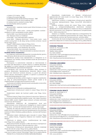 WWW.GHIDULPRIMARIILOR.RO JUDE%u021aUL BAC%u0102U / 914. Statia C.F.R. Salina %u2013 19055. Palatul Primariei 1908-19126. Macheta primei sonde de foraj mecanic %u2013 18617. Sanatoriul subteran de la Subteran 19728. Caste%u0219ul pentru arestatii ocnelor 18569. Troita fostilor detinuti politiciEvenimente:Ianuarie 2025 - na%u0219terea marelui poet Mihai Eminescu %u0219i ziua culturii na%u021bionaleIanuarie 2025 - mica unire - unirea principatelor rom%u00e2ne - moldova cu %u021bara rom%u00e2neasc%u0103-tricolor c%u0103l%u0103torMartie 2025- ziua interna%u021bional%u0103 a femeiiMai- festivalul istoric %u0219i medievalIunie 2025 %u2013 ziua interna%u021bional%u0103 a copiluluiIunie 2025 - %u00een%u0103l%u021barea domnului %u2013 ziua eroilor Iunie - auto creativ tuning team & db drag racing rom%u00e2nia romania- sound house T%u00e2rgu OcnaAugust %u2013zilele ora%u0219ului sta%u021biunii T%u00e2rgu OcnaOctombrie 2025 %u00a0%u2014%u00a0ziua%u00a0interna%u0163ional%u0103 a profesorului%u00a0Noiembrie 2025 %u2013 ziua v%u00e2n%u0103torilor de munte1 decembrie 2025%u2013 ziua na%u021bional%u0103 a Rom%u00e2niei 31 decembrie 2025 %u2013 festivalul de datini %u0219i obiceiuri de iarn%u0103Facilit%u00e3%u0163i oferite investitorilor:%u00cencurajarea %u0219i sus%u021binerea prestatorilor %u0219i produc%u0103torilor pentru diversificarea ofertei de servicii %u0219i produse localeIdentificare produs local reprezentativ %u0219i integrarea lui %u00een dezvoltarea unui simbol, LOGO, etichete locale de promovare la nivelul orasuluiParticiparea la evenimente na%u021bionale %u0219i interna%u021bionale %u00een principal cele dezvoltate %u00een zonele urbane, %u00een vederea dezvolt%u0103rii de leg%u0103turi cu actorii relevan%u021bi %u0219i promotorii de turism, circuite, pie%u021be de desfacere, aprovizionare reciproc%u0103Amenajarea unor puncte de belvedere si/sau recreere %u00een preajma obiectivelor reprezentative, bisericilor (b%u0103nci, mese, panouri de informare turistic%u0103, binoclu), cu punct de v%u00e2nzare pentru b%u0103uturi r%u0103coritoare %u0219i gust%u0103ri, %u00een special cu produse ale produc%u0103torilor/prestatorilor localiAcordarea de facilit%u0103%u021bi, conform legilor %u00een vigoare, investitorilor ce aleg s%u0103 prelucreze/integreze materii prime locale %u0219i s%u0103 implementeze conceptul de economie circularSus%u021binerea activit%u0103%u021bilor de promovare a produselor %u0219i serviciilor agen%u021bilor economici localiProiecte de investi%u0163ii:PROIECTE CU FONDURI GUVERNAMENTALEModernizare infrastructur%u0103 rutier%u0103 %u00een ora%u0219ul T%u00e2rgu Ocna 5,6 kmModernizare sistem de iluminat public ora%u0219%u00a0 T%u00e2rgu OcnaEtapa IIDotarea Ora%u0219ului T%u00e2rgu Ocna (Centrul Cultural Ion Talianu) cu bunuri privind valorificarea tradi%u021biilor locale %u2013GAL Valea Trotusului Masura 6/6B- proiect eligibil dupa evaluare urmeaza semnarea Contractului de finan%u021bareDezvoltarea sistemului de management local prin implementarea unor infrastructuri inteligente la nivelul ora%u0219ului T%u00e2rgu Ocna %u2013contract de finan%u021bare semnat -studii topo %u0219i geoAchizi%u021bia de vehicule electrice pentru serviciul de transport public local %u0219i a sta%u021biilor de %u00eenc%u0103rcare necesare pentru func%u021bionarea acestora %u00een Sl%u0103nic Moldova, jude%u021bului Bac%u0103u %u2013contract de finan%u021bare semnatDezvoltare sistem distribu%u021bie gaze naturale %u00een ora%u021bul T%u00e2rgu Ocna, jude%u021bul Bac%u0103u, Programul Na%u021bional de Investi%u021bii Anghel SalignyConstruire %u0219i dotare centru multifunc%u021bional tip cre%u0219%u0103, ora%u0219%u00a0T%u00e2rgu Ocna, jude%u021bul Bac%u0103uReducerea emisiilor de gaze cu efect de ser%u0103%u00a0%u00een traansporturi: sta%u021bii de re%u00eenc%u0103rcare pentru vehicule electrice -AFMDezvoltarea infrastructurii educa%u021bionale aferente Gr%u0103dini%u021bei Floare de Col%u021b%u00a0din ora%u0219ul T%u00e2rgu Ocna, jude%u021bul Bac%u0103uDezvoltarea infrastructurii educa%u021bionale prin construirea unui corp nou %u00een cadrul Liceului Tehnologic T%u00e2rgu Ocna, jude%u021bul Bac%u0103uPROIECTE CU FONDURI EXTERNE NERAMBURSABILEDezvoltarea modernizarea %u0219i dotarea infrastructurii opera%u021bionale din cadul %u0218colii nr.2 ora%u0219%u00a0 T%u00e2rgu Ocna %u2013POR 2014-2020- lucr%u0103ri finalizateValorificare turistic%u0103 %u0219i modernizare infrastructur%u0103 specific%u0103 %u00een sta%u021biunea balneoclimatic%u0103 T%u00e2rgu Ocna-POR 2014-2020-%u00een execu%u021bieDotarea unit%u0103%u021bilor %u0219colare din ora%u0219ul T%u00e2rgu Ocna, jude%u021bul Bac%u0103u, cu echipamente/dispozitive electronice necesare desf%u0103%u0219ur%u0103rii activit%u0103%u021bii didactice %u00een mediul on-line%u00a0%u0219i a indicatorilor tehnico-economici, prin Programul Opera%u021bional Competitivitate 2014 %u2013 2020, Ac%u0163iunea 2.3.3Dotarea cu mobilier, materiale didactice %u0219i echipamente TIC a unit%u0103%u021bilor de %u00eenv%u0103%u021b%u0103m%u00e2nt preuniversitar din ora%u0219ul T%u00e2rgu Ocna, jude%u021bul Bac%u0103u contract de finan%u021bare semnat- achizi%u021bie dot%u0103riConstruirea de insule ecologice digitalizate pentru colectarea selectiv%u0103%u00a0a de%u0219eurilor la nivelul ora%u0219ului T%u00e2rgu Ocna, jude%u021bul Bac%u0103uCOMUNA TRAIANAdres%u0103: Str. Principal%u0103, nr.199Cod po%u0219tal: 607635Telefon: 0234-221042; Fax: 0234-221050; Adresa de e-mail: public@primariatraianbacau.ro comunatraian@yahoo.comURL: http://www.primariatraianbacau.roCOMUNA UNGURENICod po%u0219tal: 607645Telefon: 0234-227012; Fax: 0234-227012; Adresa de e-mail: primaria_ungureni@yahoo.com contact@primaria-ungureni.roURL: http://primaria-ungureni.ro/COMUNA URECHE%u015eTICod po%u0219tal: 607655Telefon: 0234-335500; Fax: 0234-335591; Adresa de e-mail: primaria.urechesti@gmail.comCOMUNA VALEA SEAC%u0102Adres%u0103: Str. Eternit%u0103%u021bii, nr. 2Cod po%u0219tal: 607660Telefon: 0234-